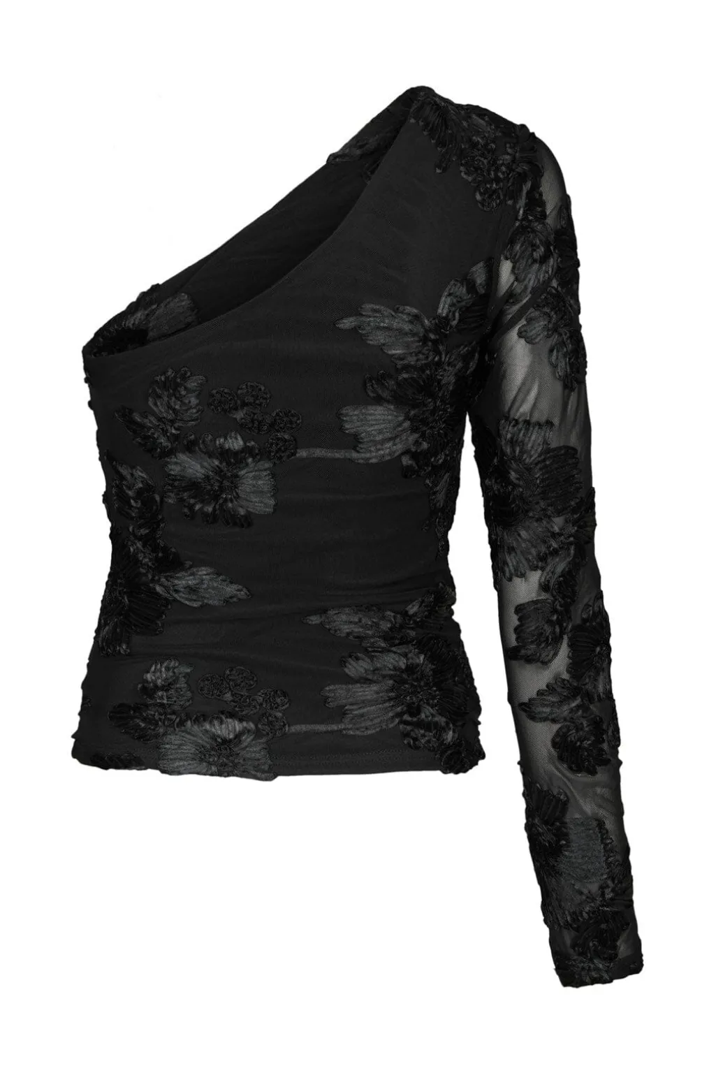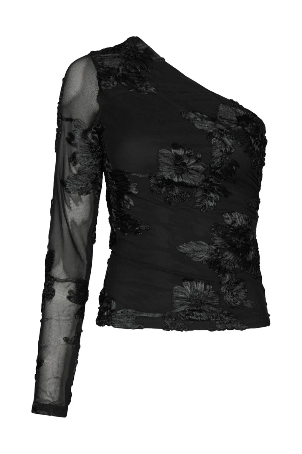 Sort meshbluse fra Neo Noir med blomsterbroderi. Blusen har én-skulderdesign med rynkeeffekt og et langt ærme i mesh. Broderede blomster pryder både fronten og ærmet.