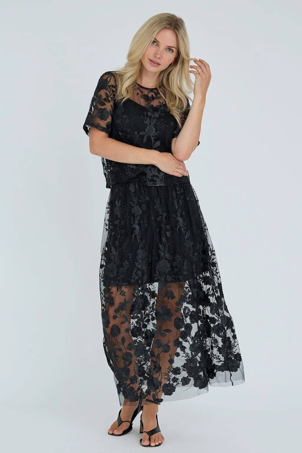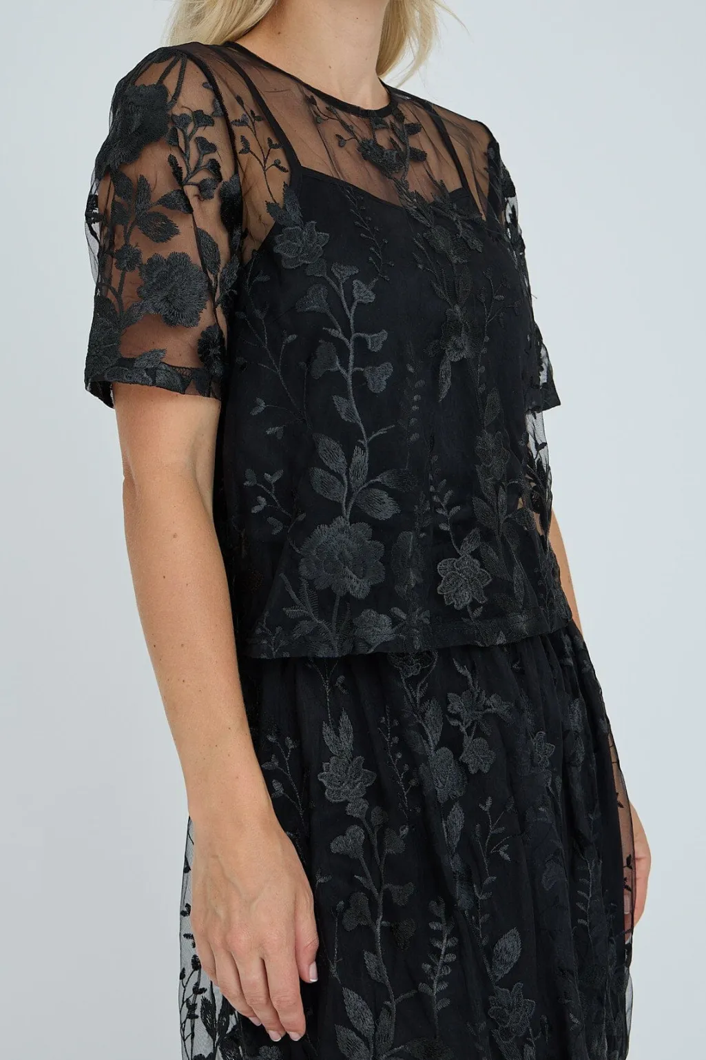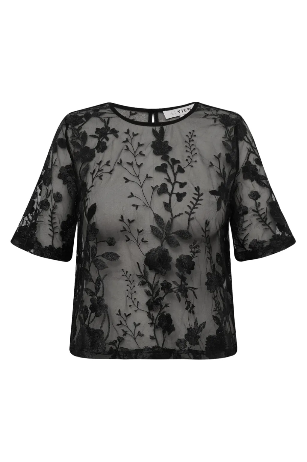 Sort bluse fra A-View, lavet af transparent mesh med broderede blomster. Blusen har korte, løse ærmer og en rund halsudskæring.