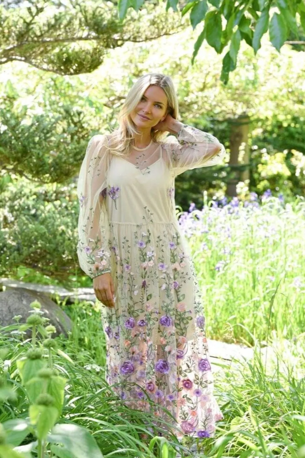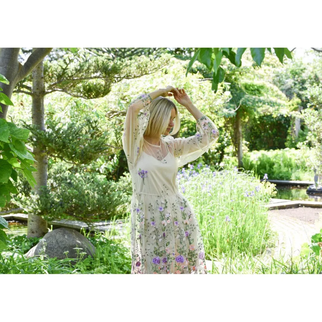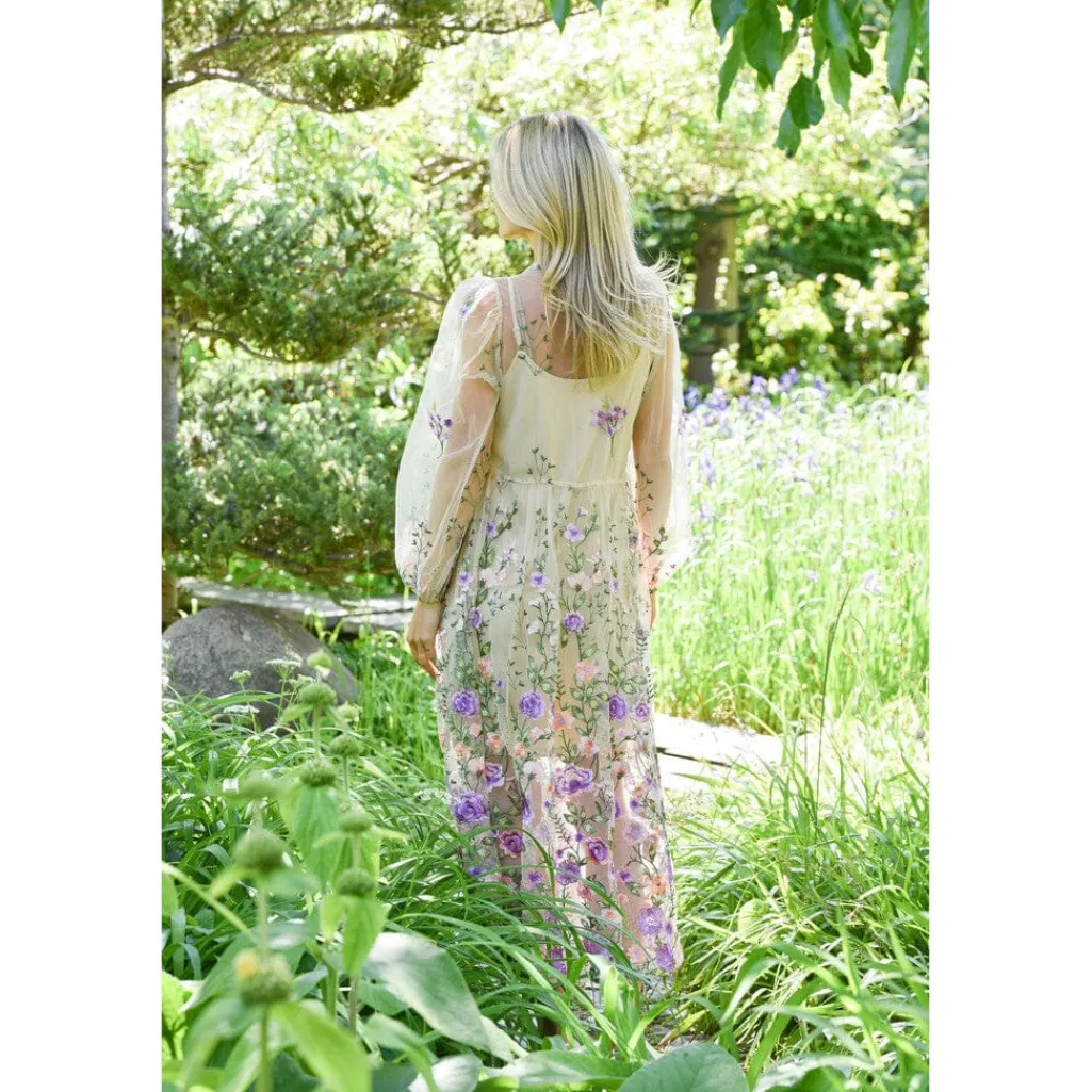 En ankel-lang kjole fra A-View i transparent mesh med broderede blomster i grøn og lilla. Kjolen har en løs pasform og passer til bryllupper og festlige lejligheder.