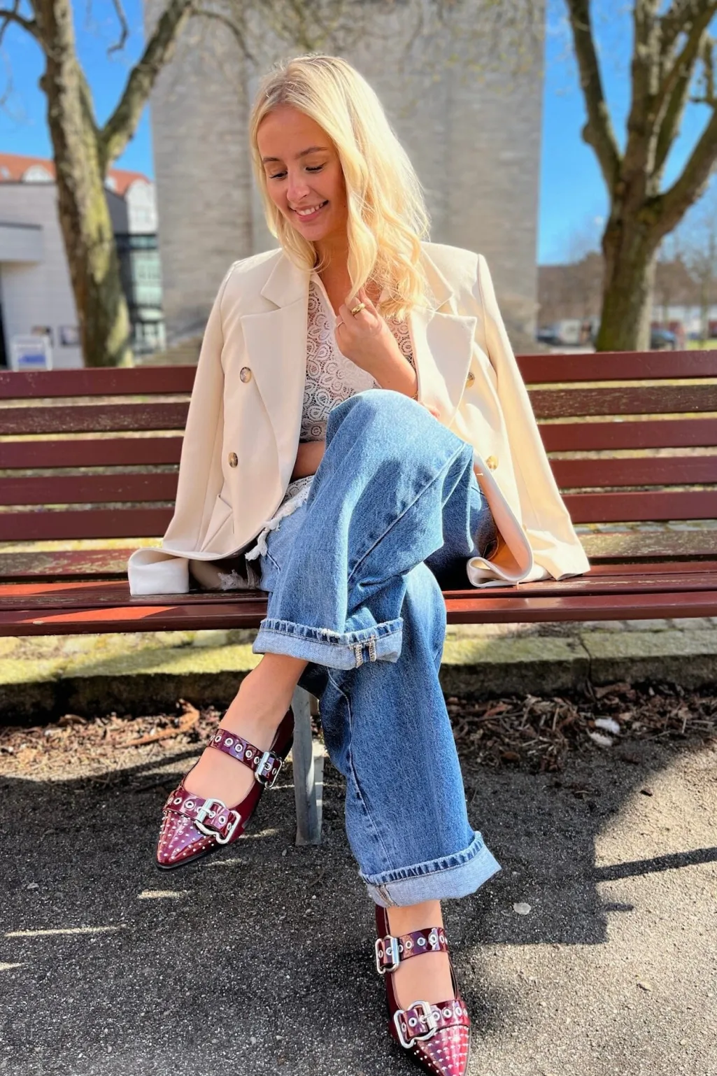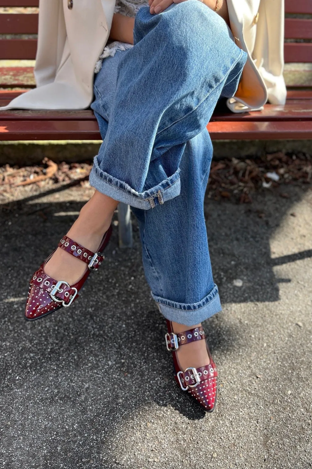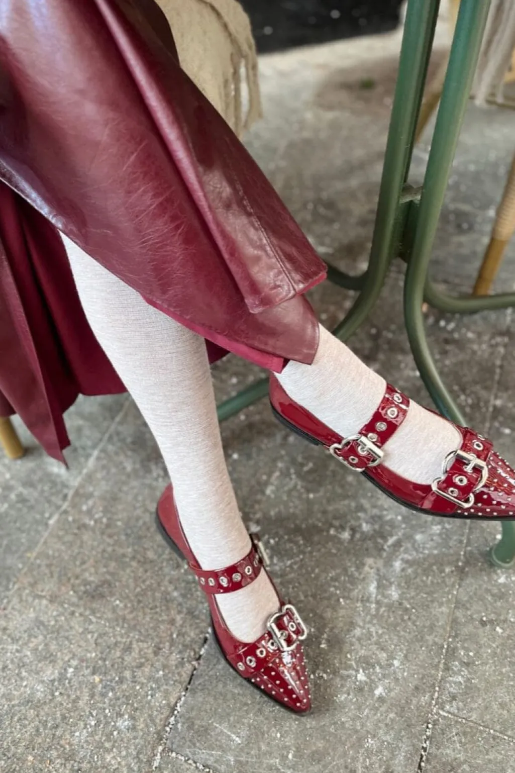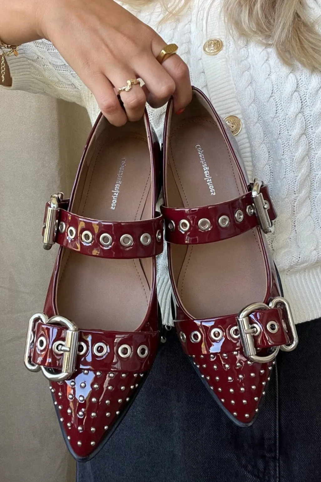 Bordeauxfarvet ballerina fra Copenhagen Shoes i blank patentlæder. Skoen har spids tå og spændelukning, der gør den nem at tilpasse.