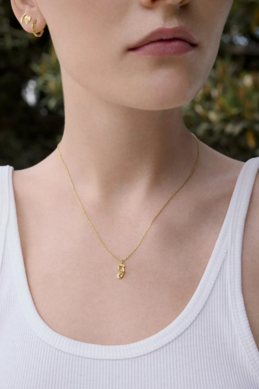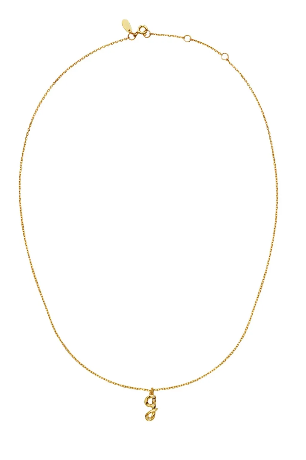 Guldbelagt halskæde fra Maanesten med et G-formet vedhæng. Halskæden er lavet af genanvendt sterlingsølv med en 18 karat guldbelægning og har små dekorative detaljer på vedhænget.