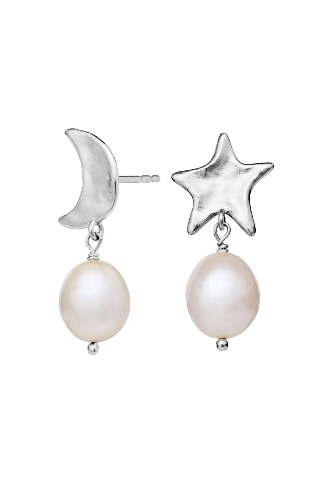 Sølvøreringe fra Maanesten med måne- og stjerneformede vedhæng. De asymmetriske øreringe har hvide perler og en skinnende overflade i genanvendt sterling sølv.