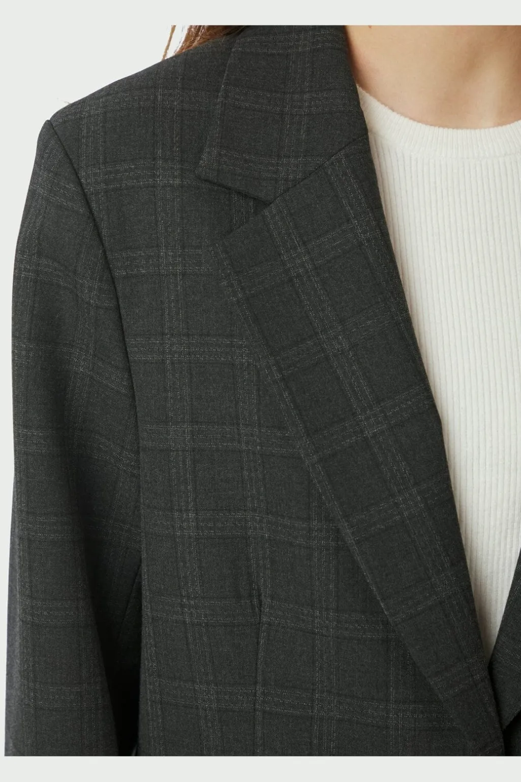 Ternet blazer fra Neo Noir i antracitgrå. Blazeren har en oversize pasform med skulderpuder og enkelt knaplukning foran. V-udskæring og forlommer med klap giver blazeren et praktisk design.