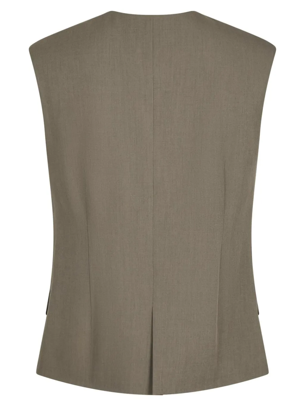 Khakifarvet vest med struktureret overflade fra Neo Noir. Vesten har V-halsudskæring, knaplukning foran og to praktiske lommer.