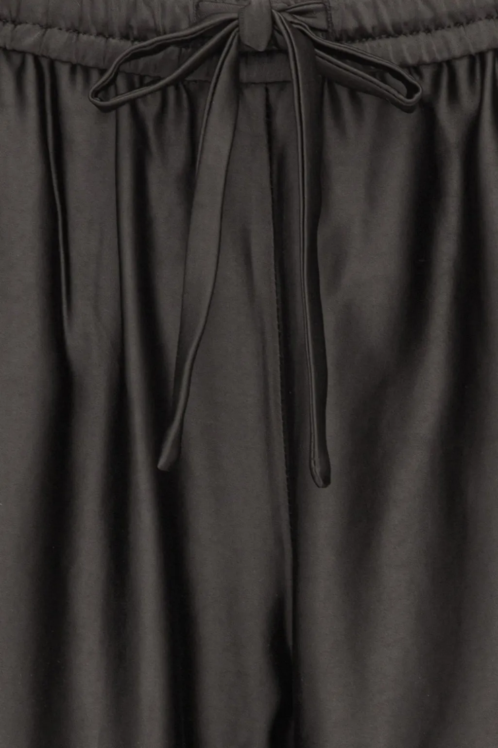 Sorte satinbukser fra Karmamia med løs pasform. Bukserne har en skinnende overflade og en behagelig ankellængde med elastik og snøre i taljen.