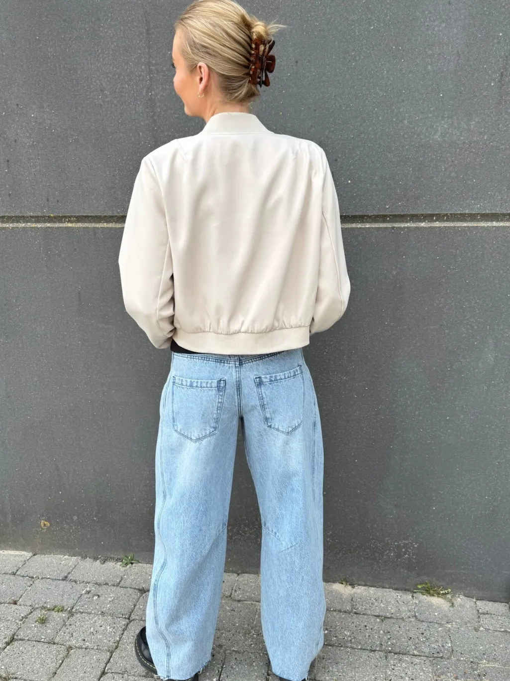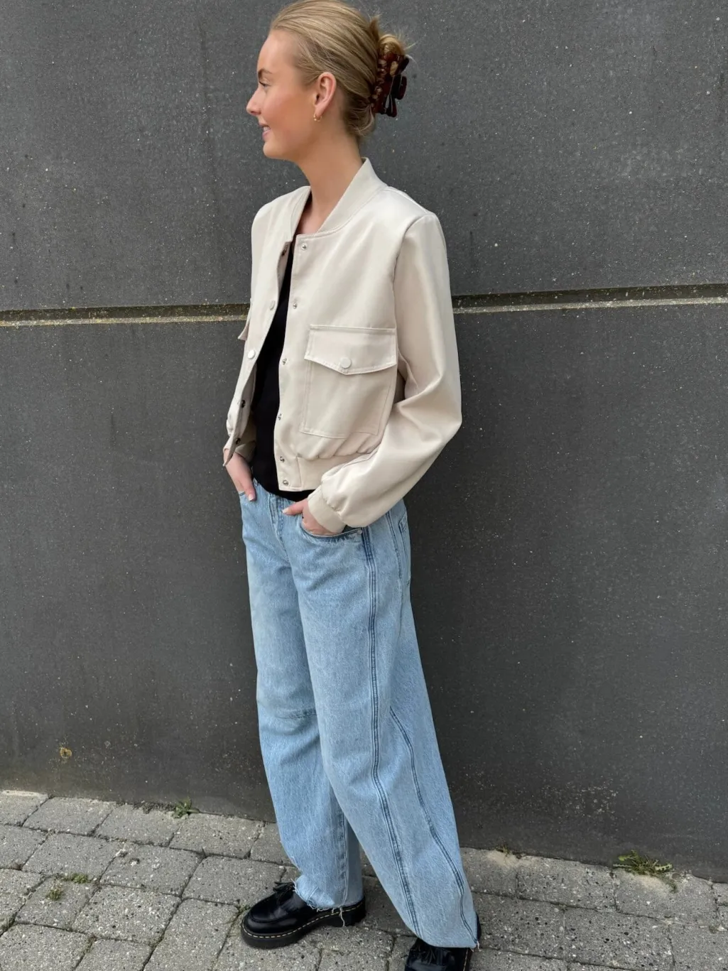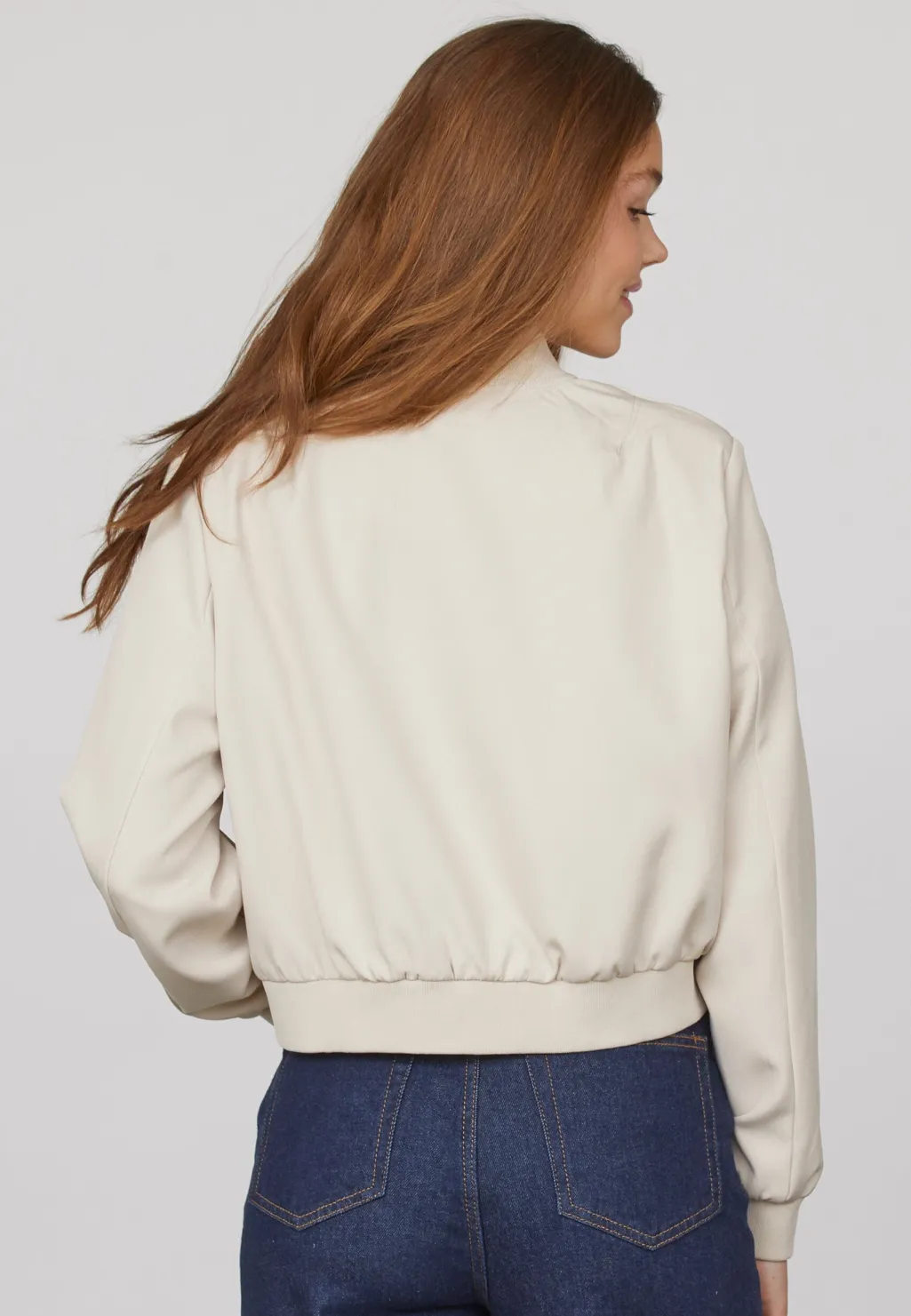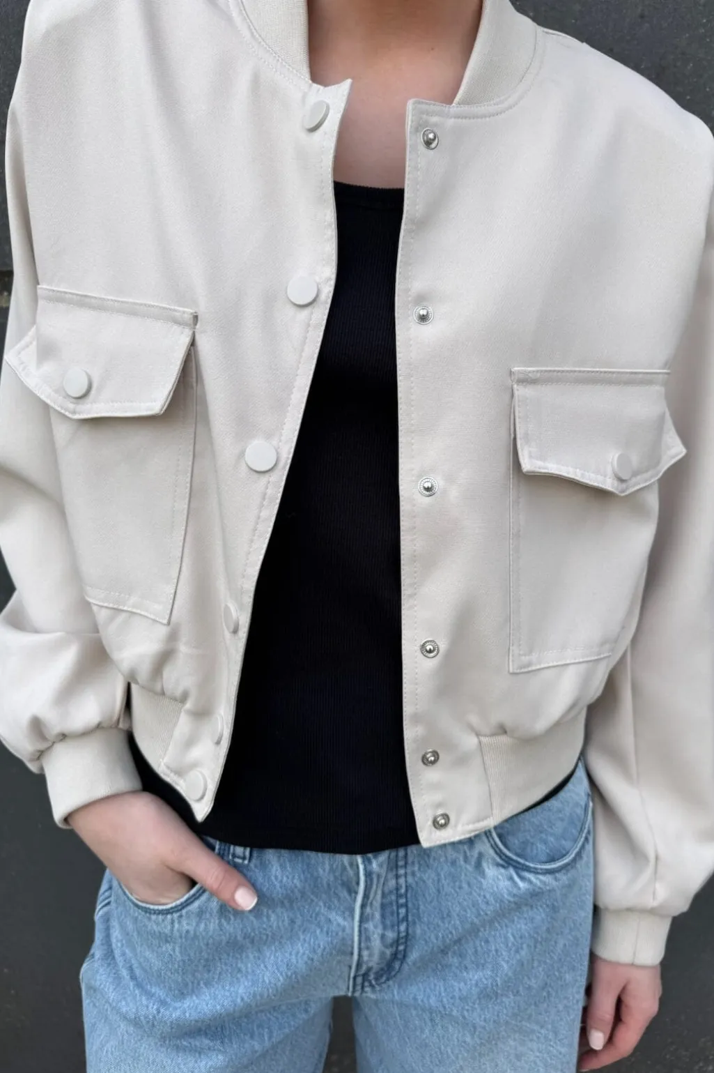 Beige bomberjakke med knaplukning foran. Jakken har en rund hals og brede ribkanter ved talje og nakke. De to forlommer og dekorative syninger giver jakken et sporty udtryk.