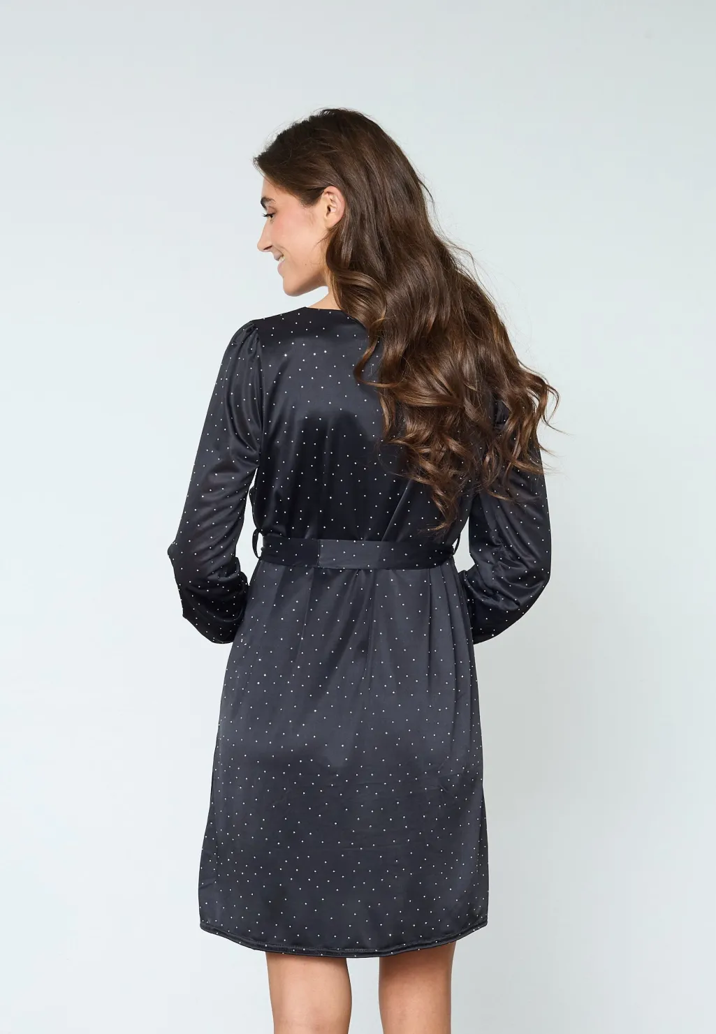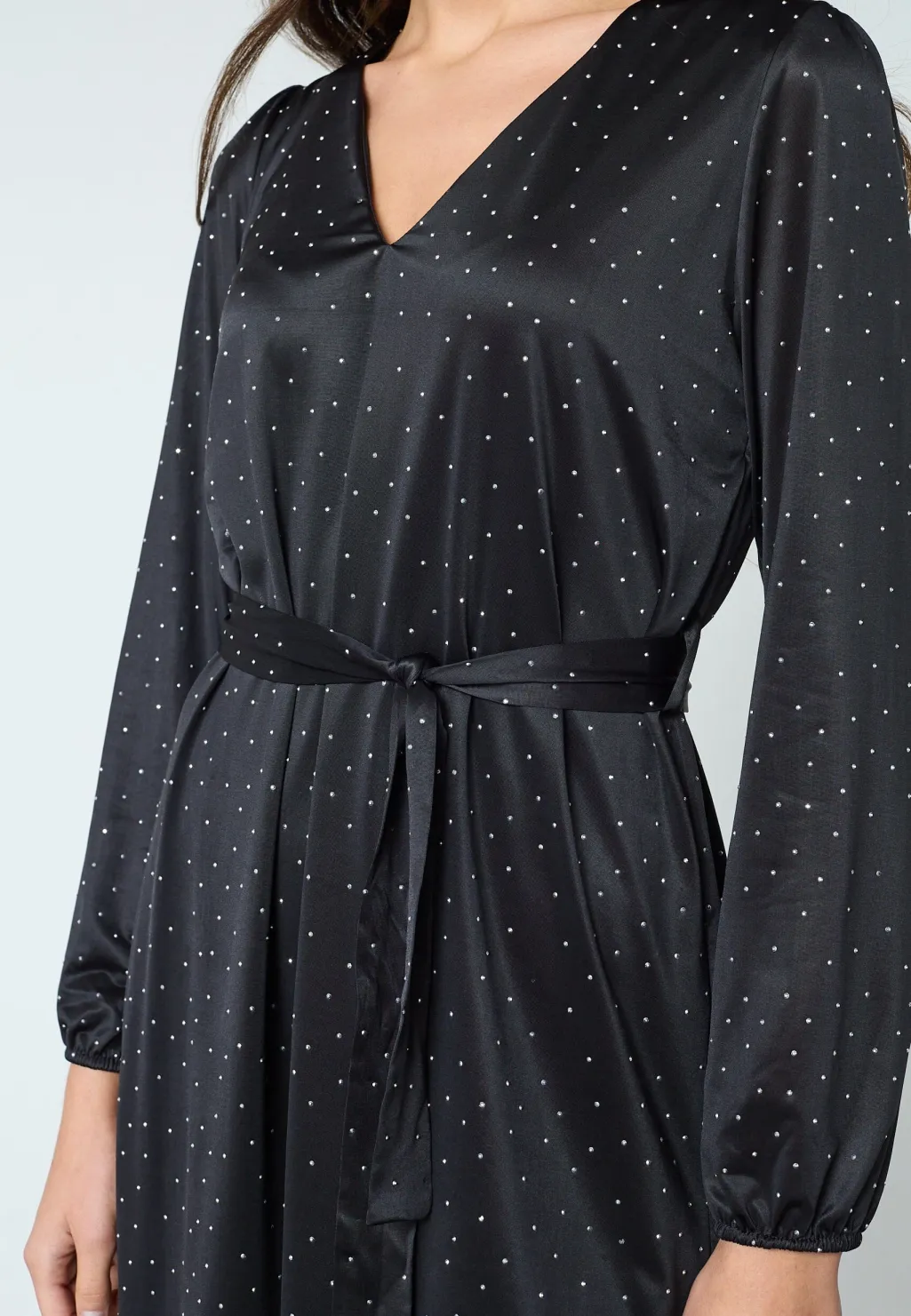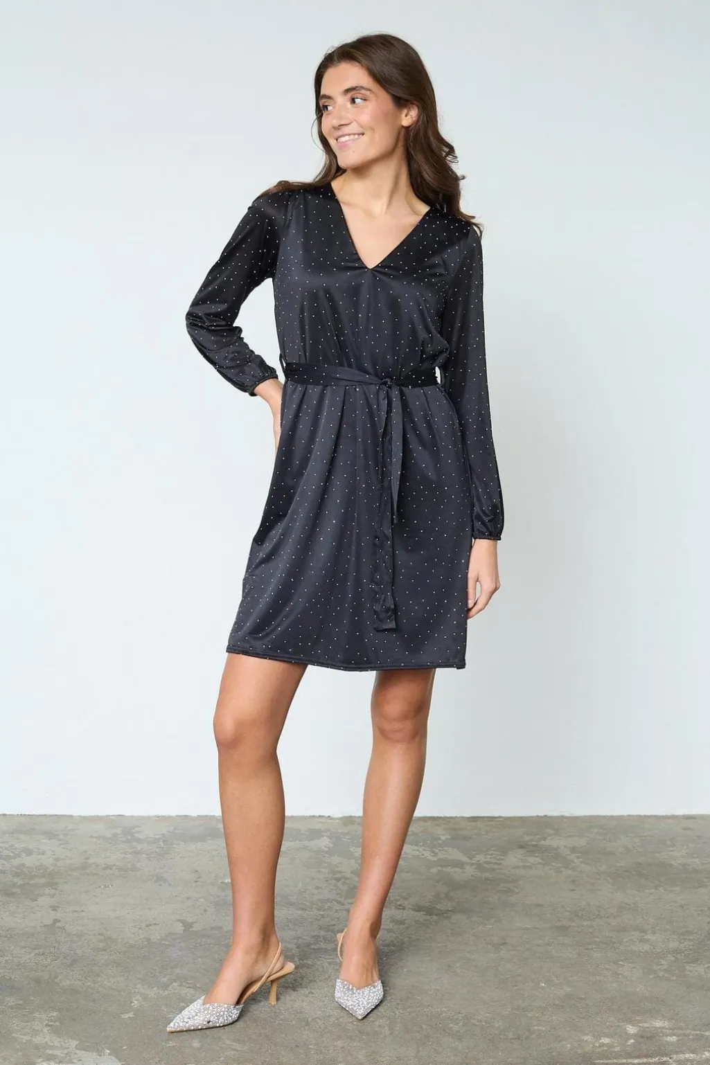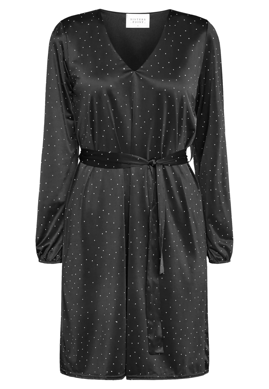 Sort kjole fra Sisters Point i glat, blankt stof med små rhinsten. Kjolen har lange ærmer og et bindebælte i taljen.