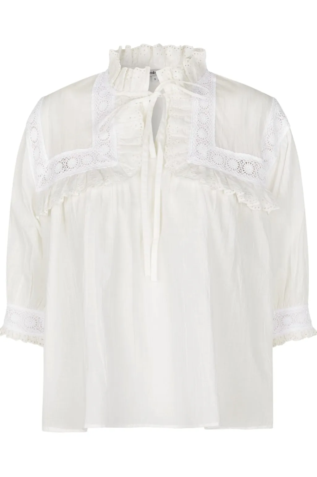 Hvid bluse fra MbyM med rynket høj hals og blondedetaljer. Blusen har 3/4 ærmer med blondekant og snøredetaljer ved halsen. Let og luftigt design i bomuldsstof.