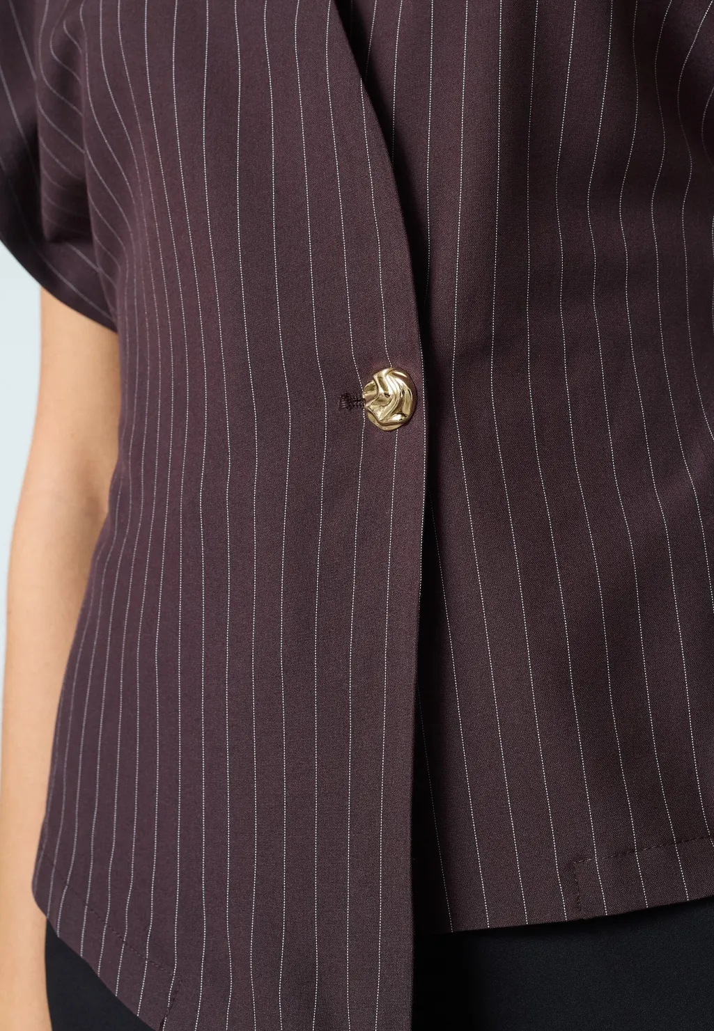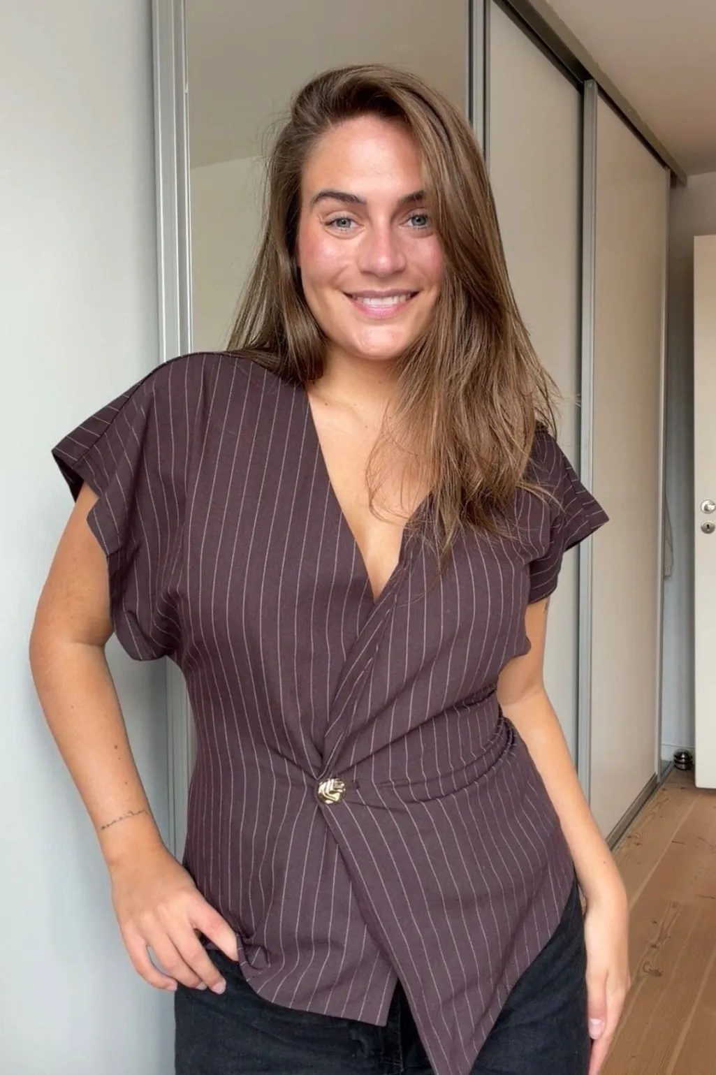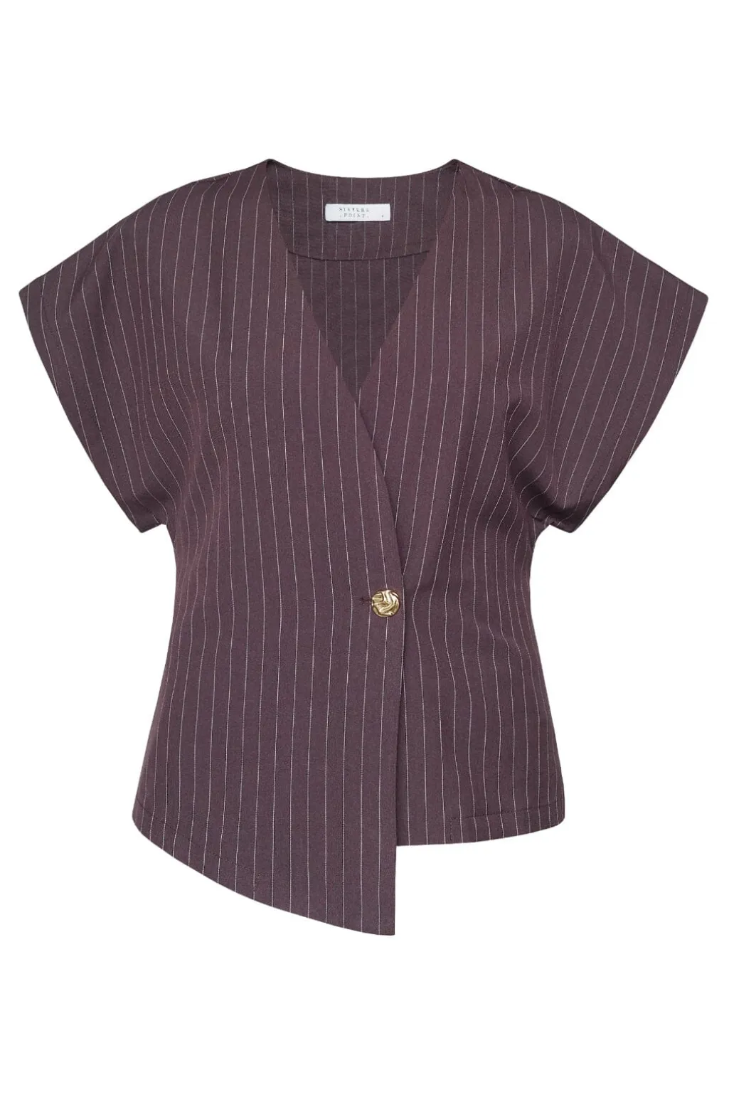 Brunstribet bluse fra Sisters Point med asymmetrisk snit og dyb V-udskæring. Blusen har en enkelt knapdetalje og korte ærmer.