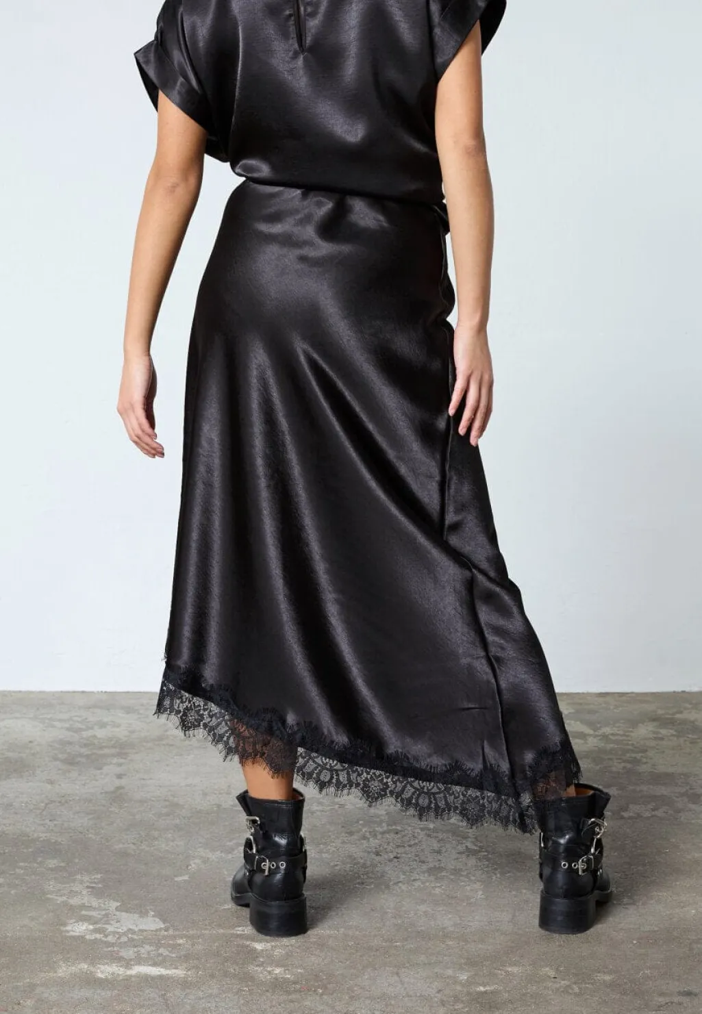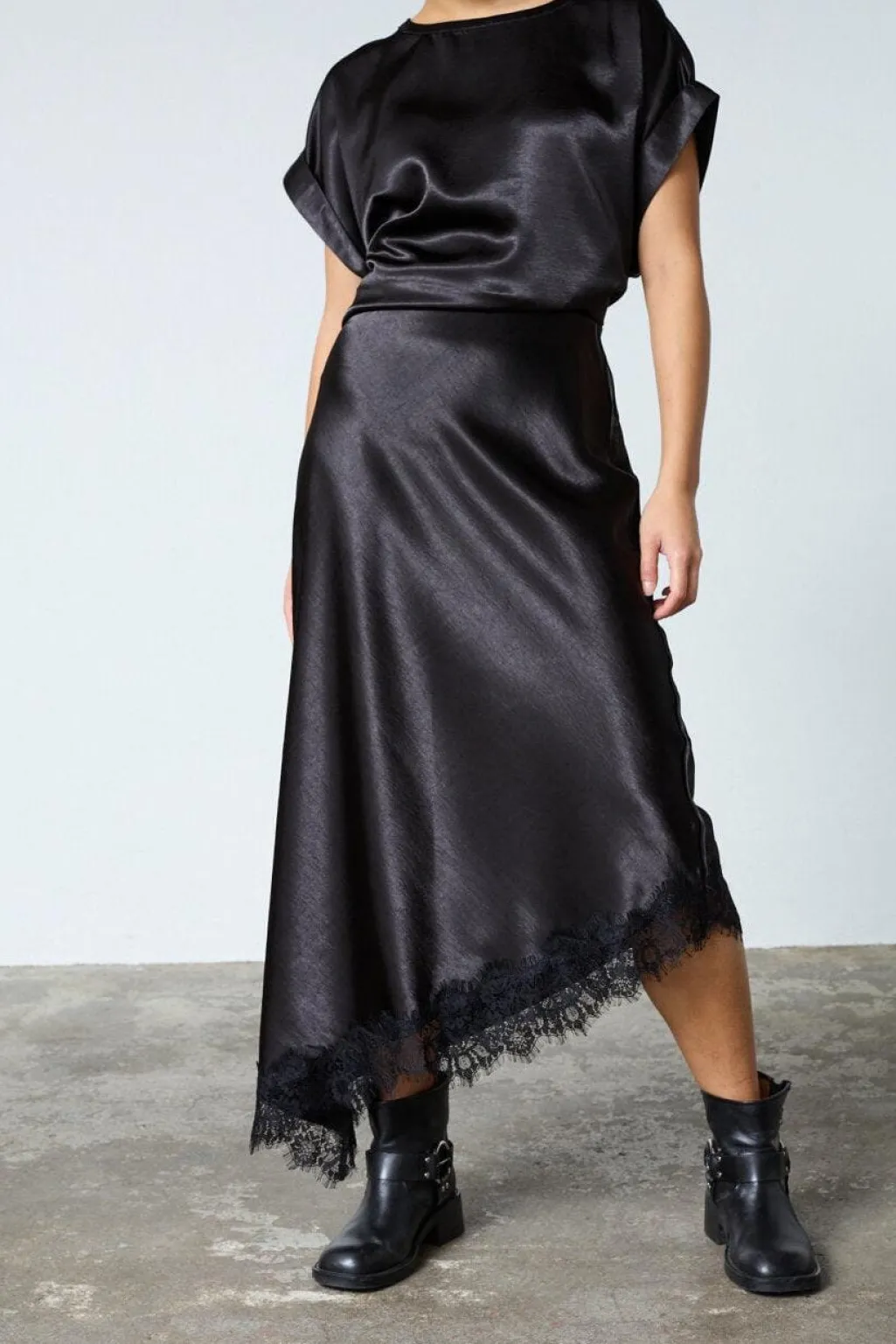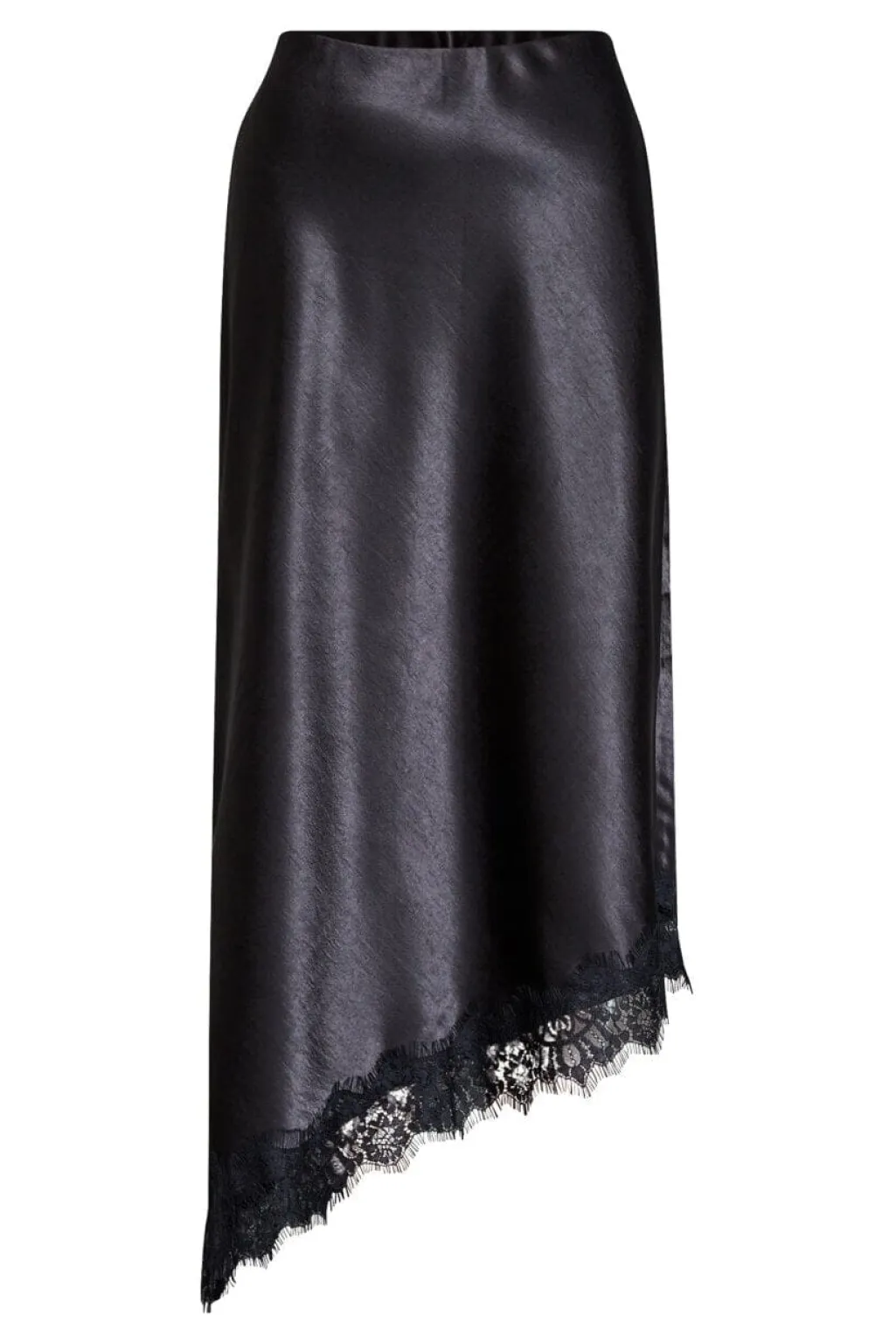 Sort nederdel fra Sisters Point med et skinnende satinlook i vævet polyester. Nederdelen har et asymmetrisk snit med en skrå kant prydet med blonde.