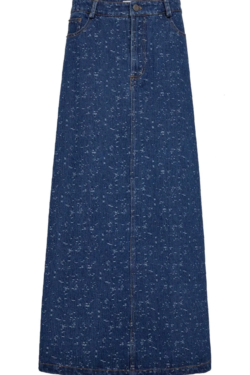 Lang nederdel fra Gossia i blå denim. Nederdelen når ned til anklerne og har en let flared form med synlig syning foran.