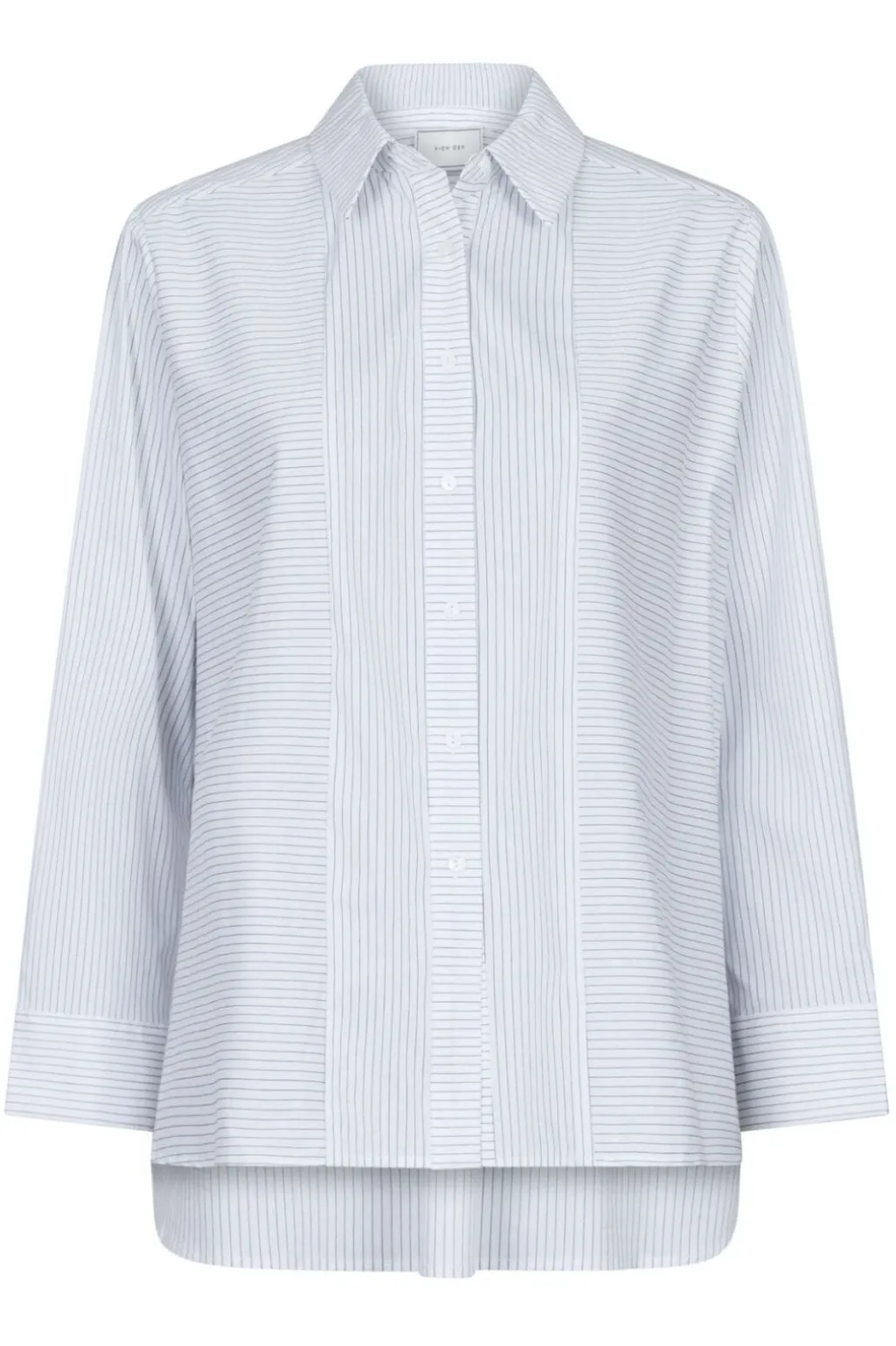 Stribet skjorte fra Neo Noir i hvid med lyseblå striber. Skjorten har en oversized pasform med brede ærmer og 3/4-ærmelængde. Skjortekraven og knapperne giver et klassisk præg.