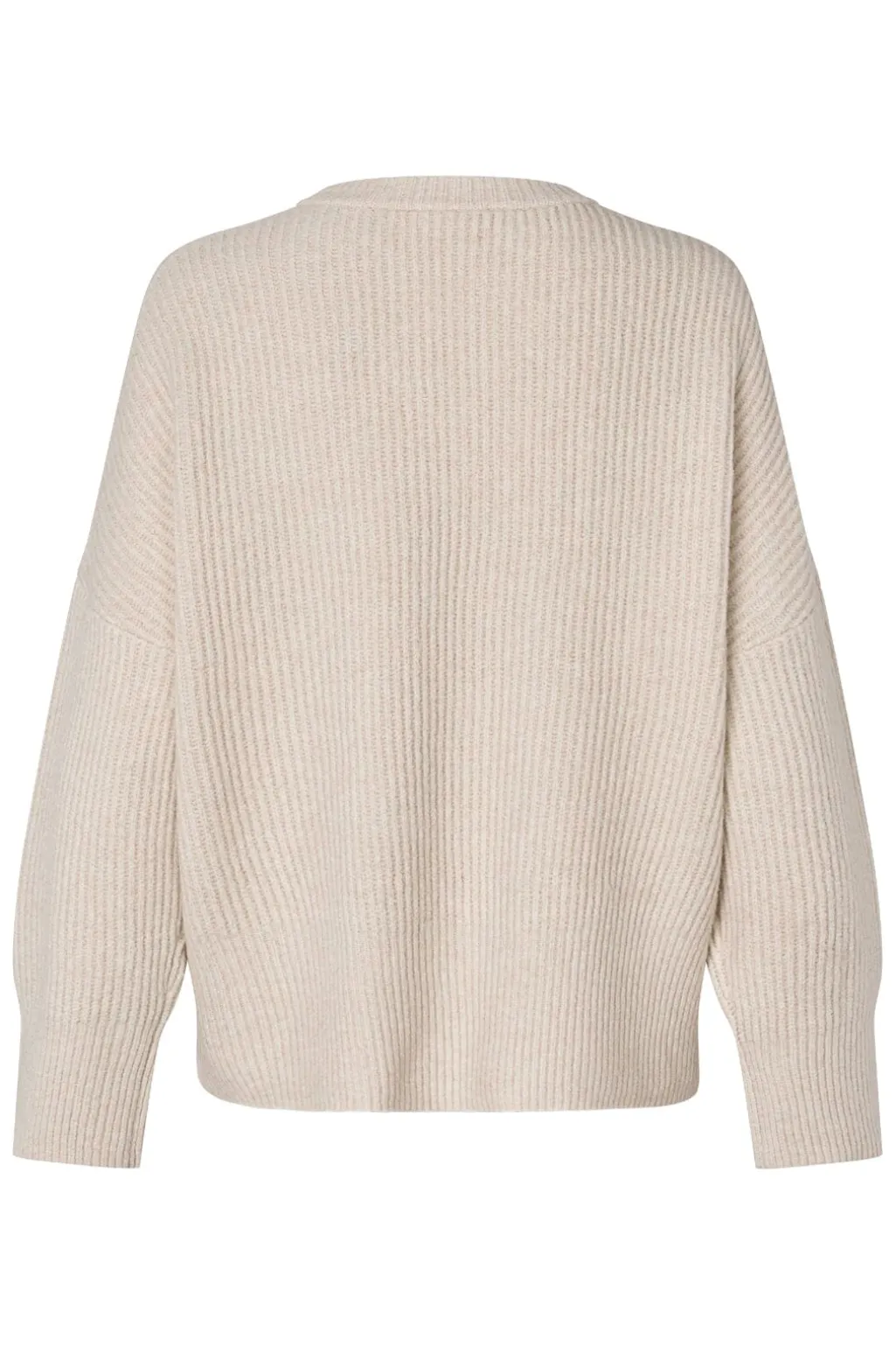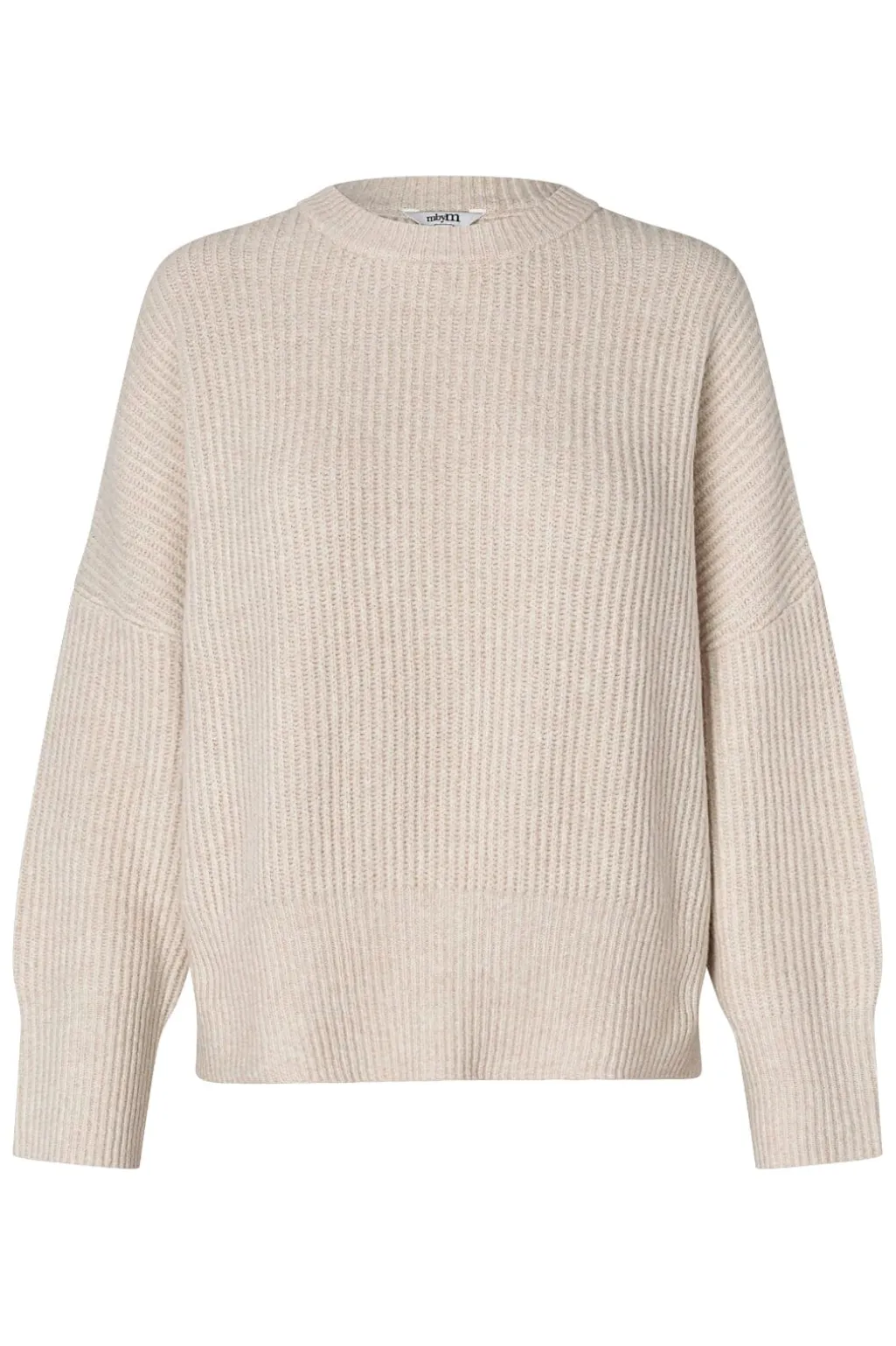 En ribbet sweater fra MbyM i farven Oyster Melange, en lys beige nuance. Sweateren har en rund halsudskæring og lange ærmer.