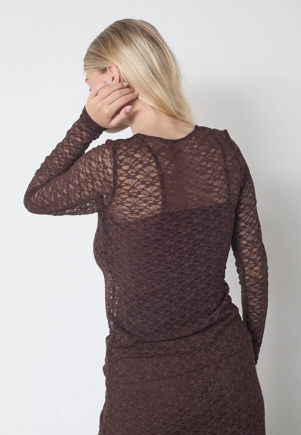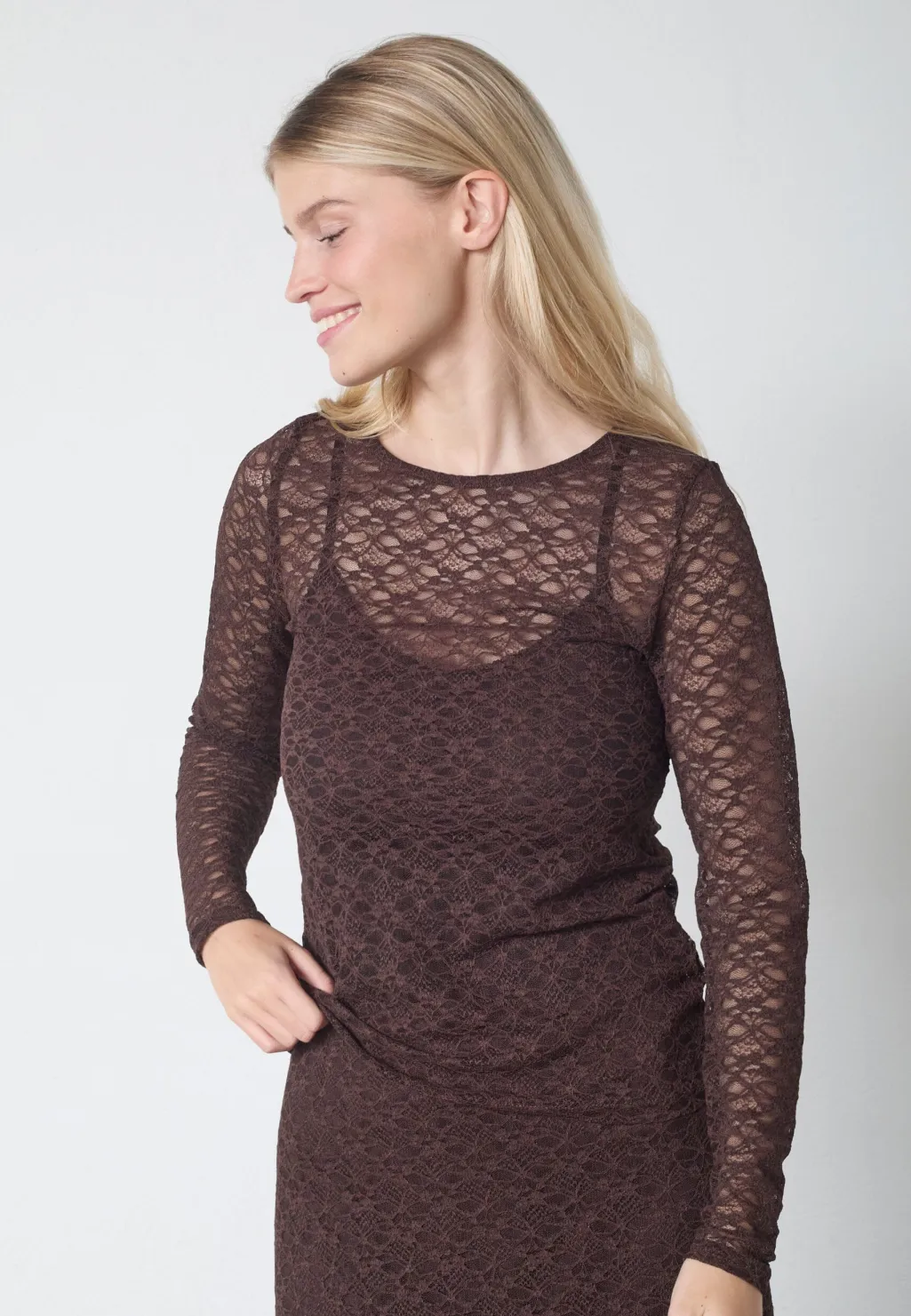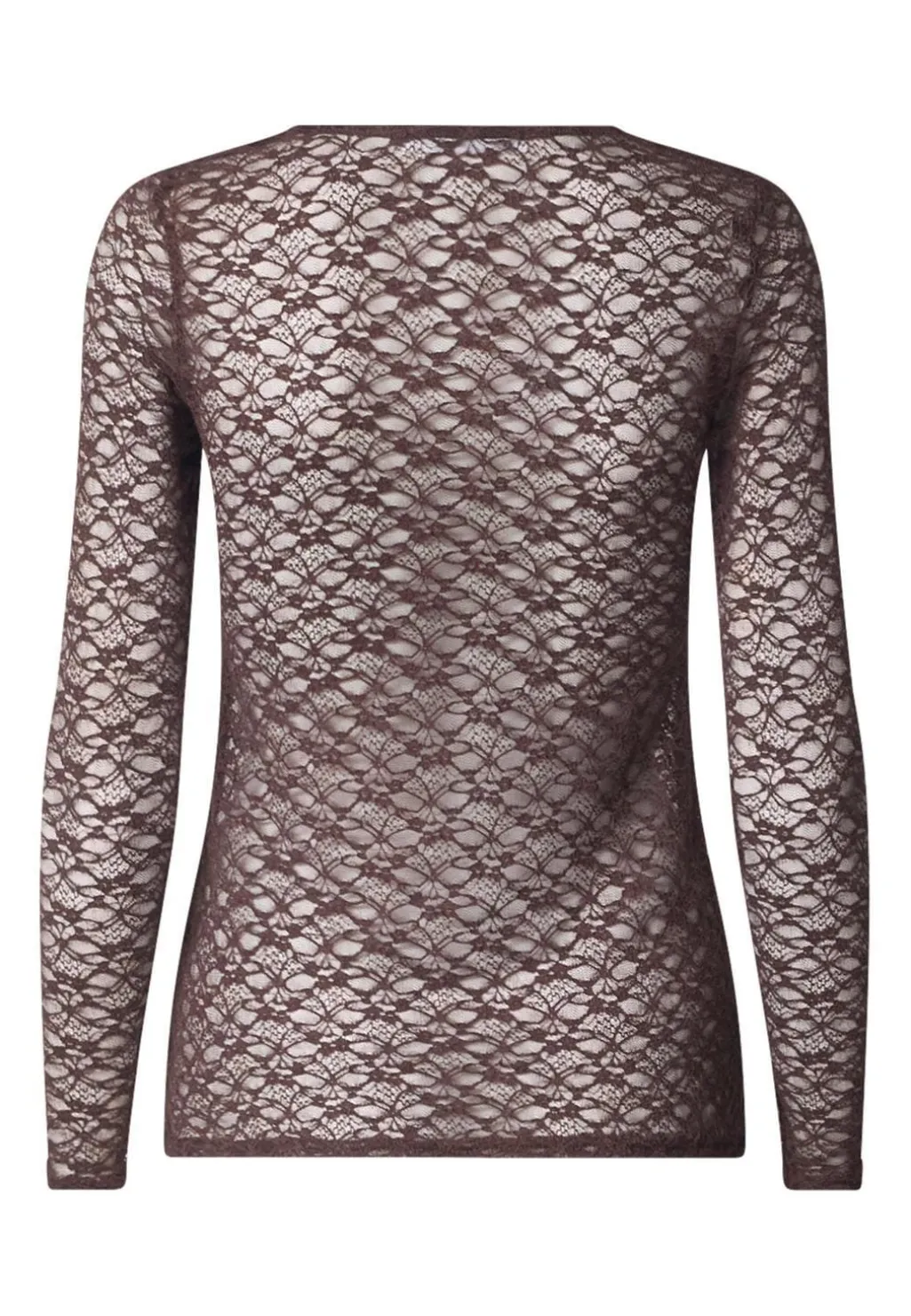 Langærmet bluse fra Sisters Point, lavet af gennemsigtig blonde i en mørk brun nuance. Blusen har et blomstermønster og en rund halsudskæring.