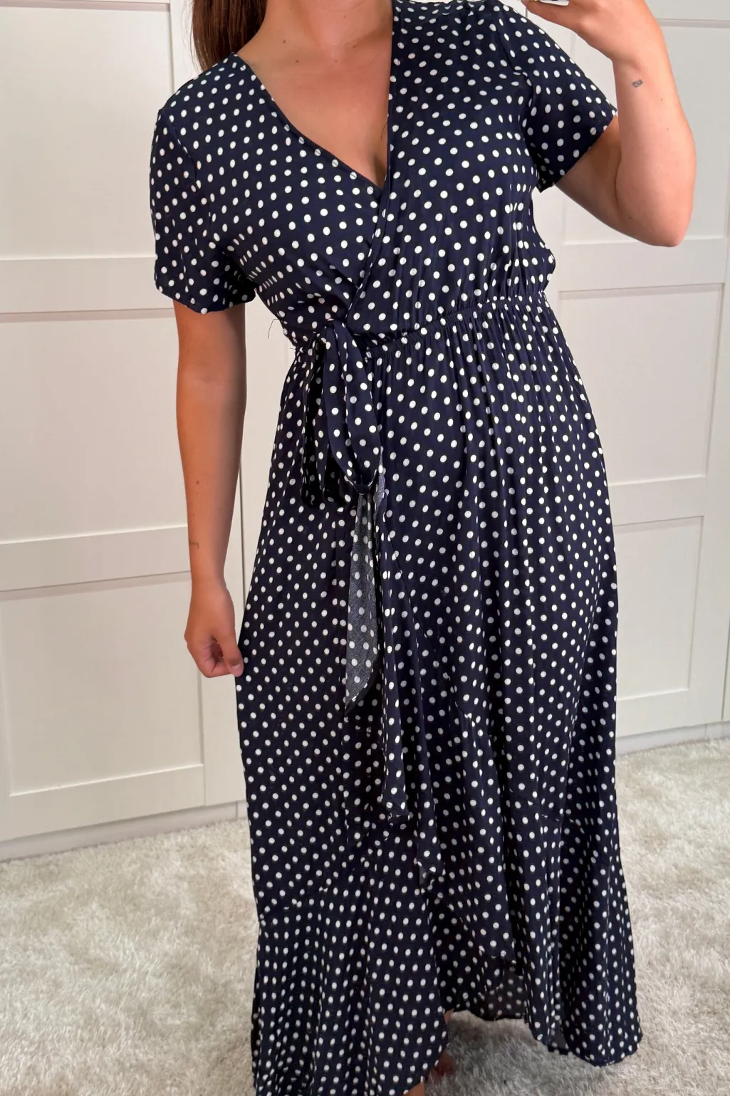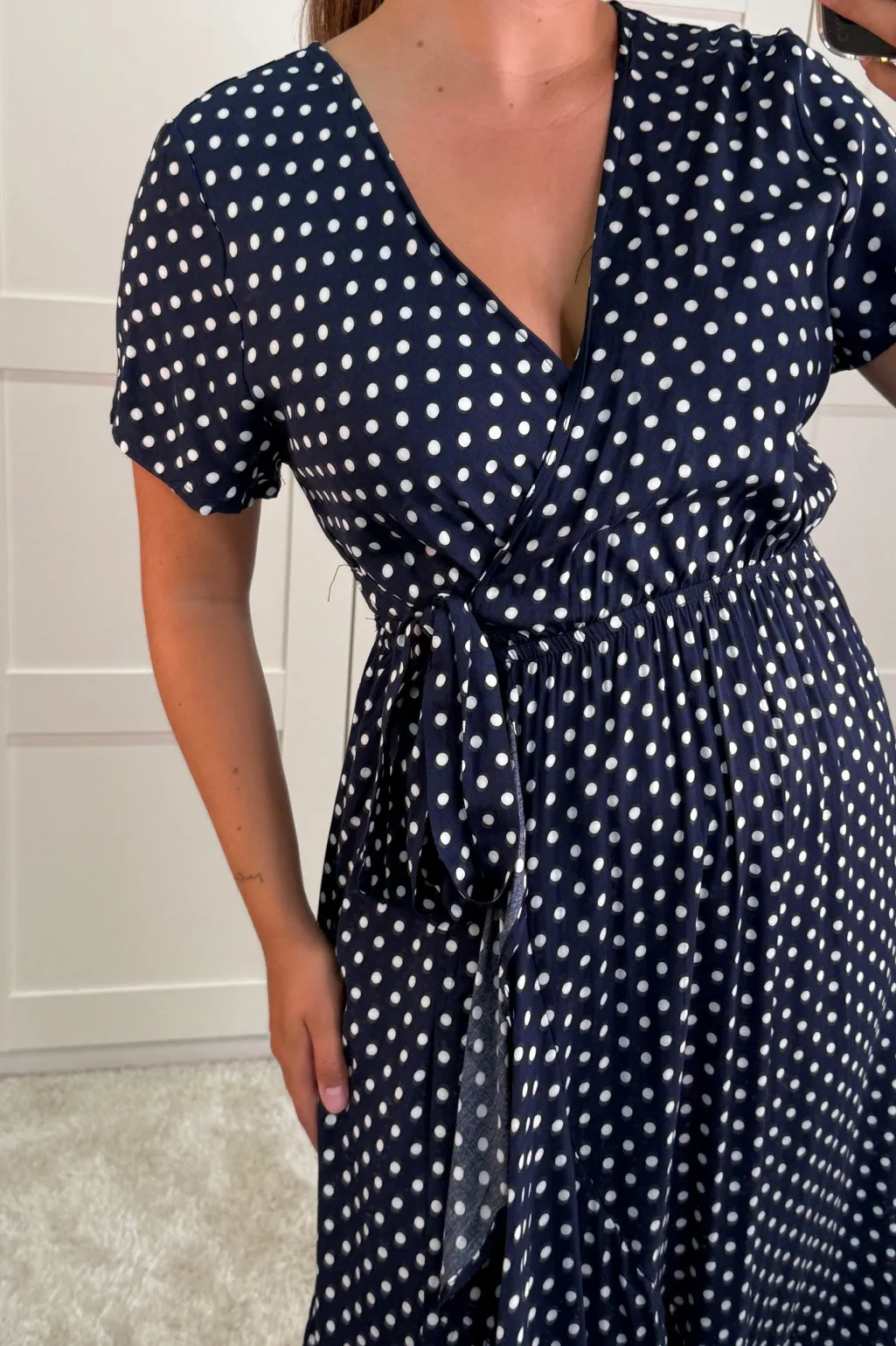 Wrap-kjole fra A-bee i mørkeblå med hvide polkaprikker. Kjolen har korte ærmer, V-hals og når til midt på læggen.