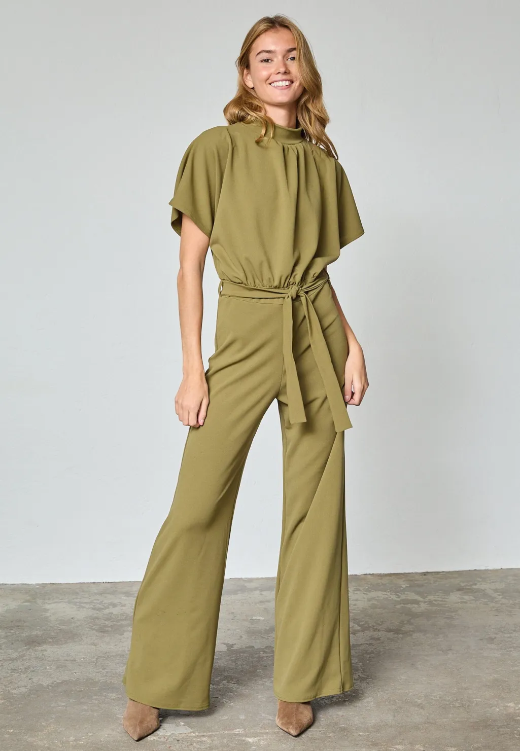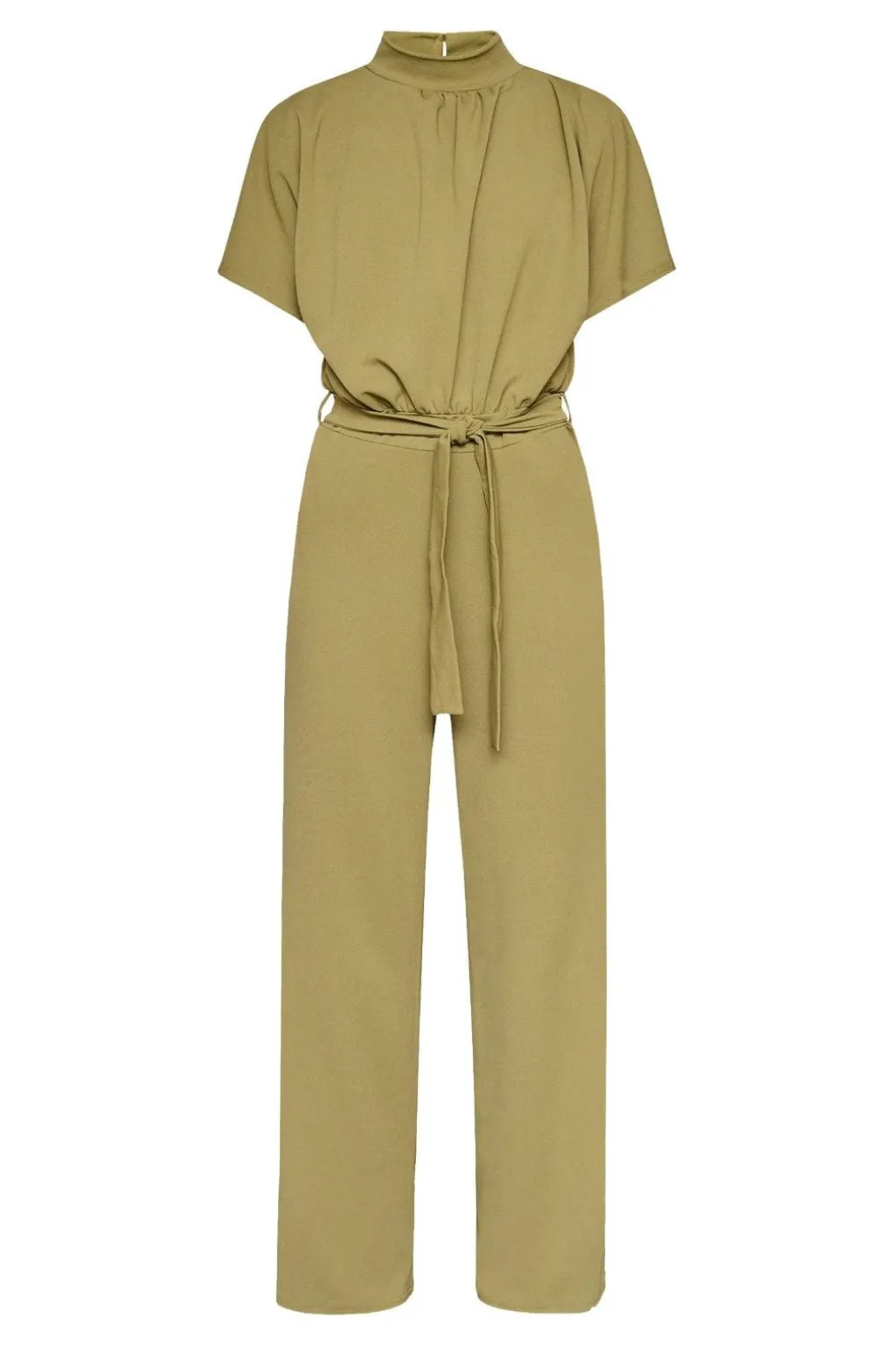 Jumpsuit fra Sisters Point i en khaki grøn farve. Materialet er 95% polyester og 5% elastan, og jumpsuiten har en løs pasform med gulvlang længde.