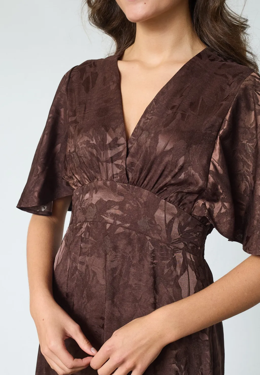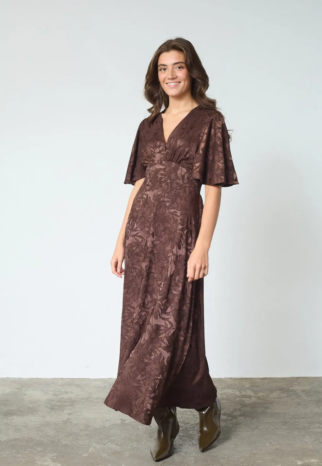 Brun kjole fra Sisters Point med blomsterprint i brune nuancer. Kjolen har ankel-længde og er lavet af 100 % polyester.