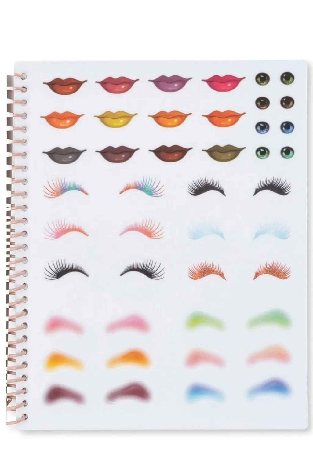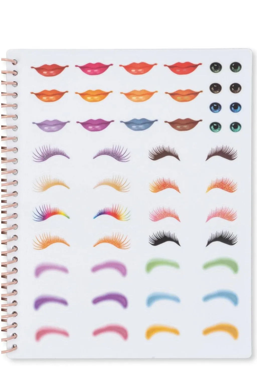 Klistermærkebog fra Konges Sløjd med spiralryg. Bogen indeholder ansigtsillustrationer, der kan dekoreres med de medfølgende klistermærker som læber, øjenvipper og øjne.