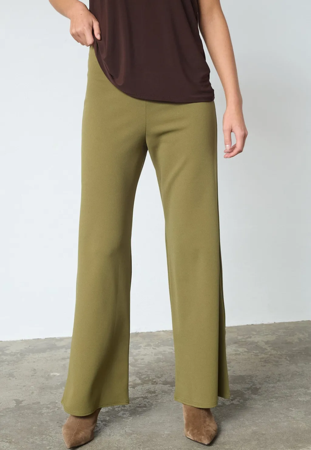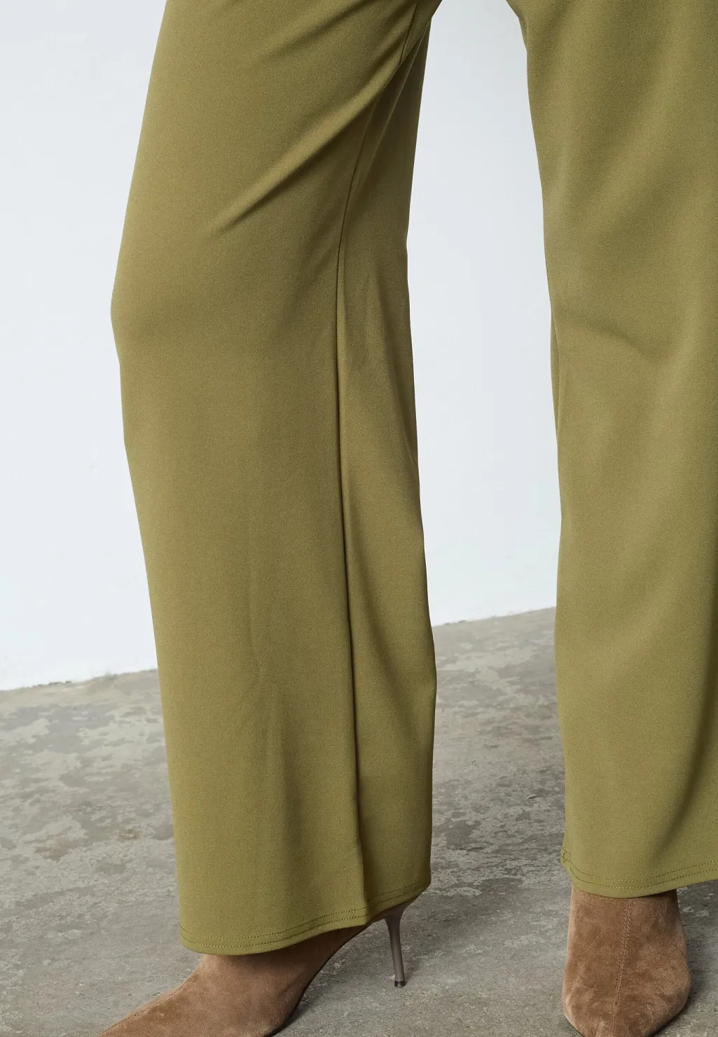 Bukser fra Sisters Point i olivengrøn med brede ben og en løs pasform. Den høje talje og det ensfarvede design giver bukserne en moderne stil.