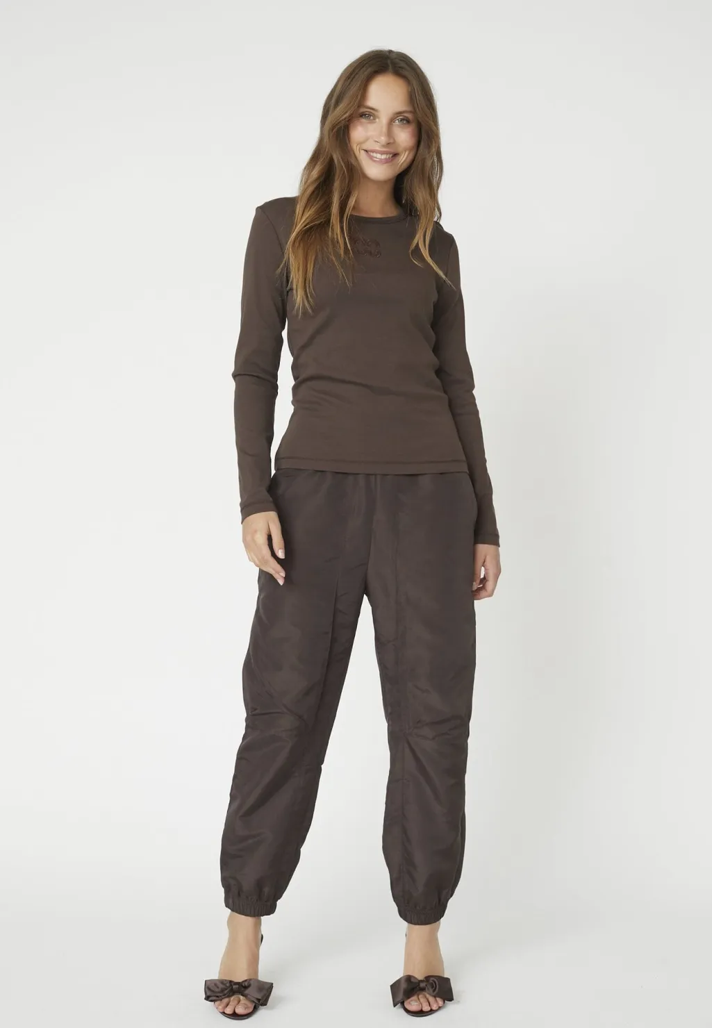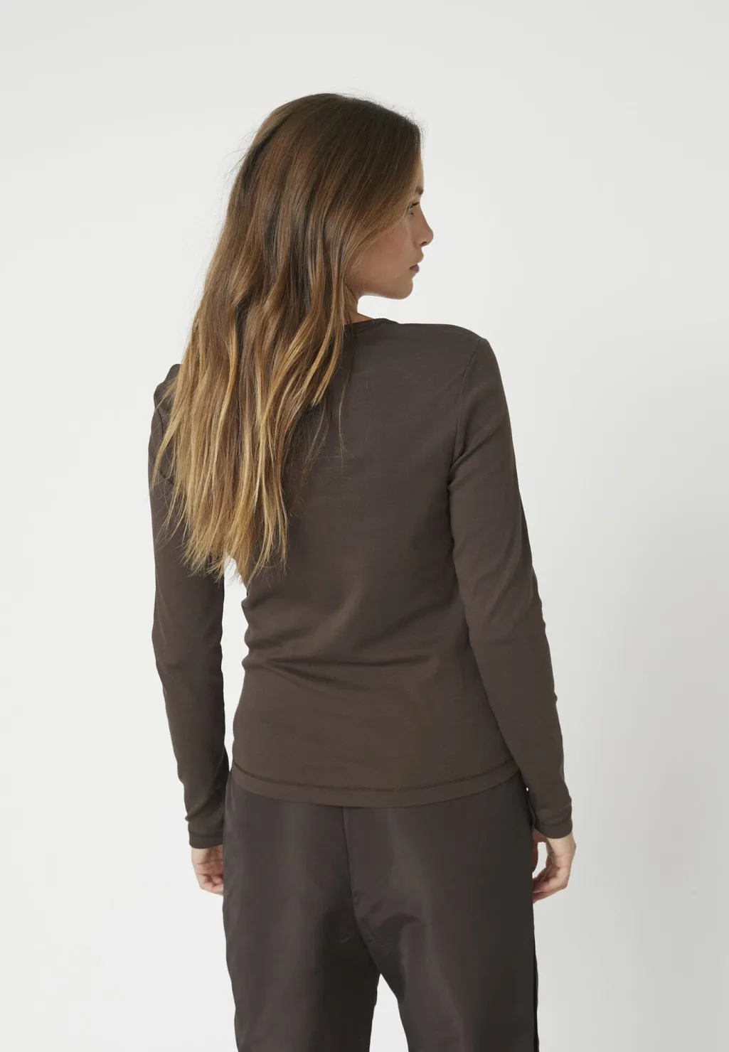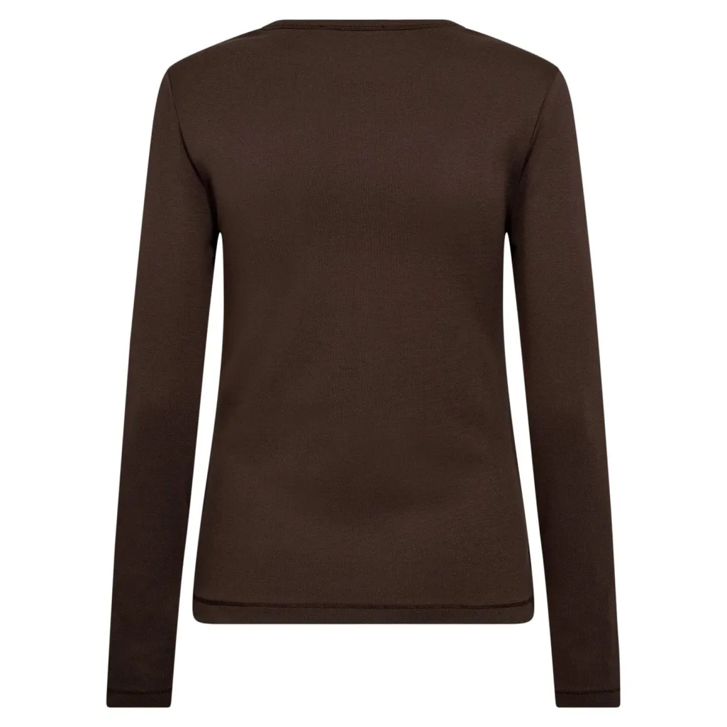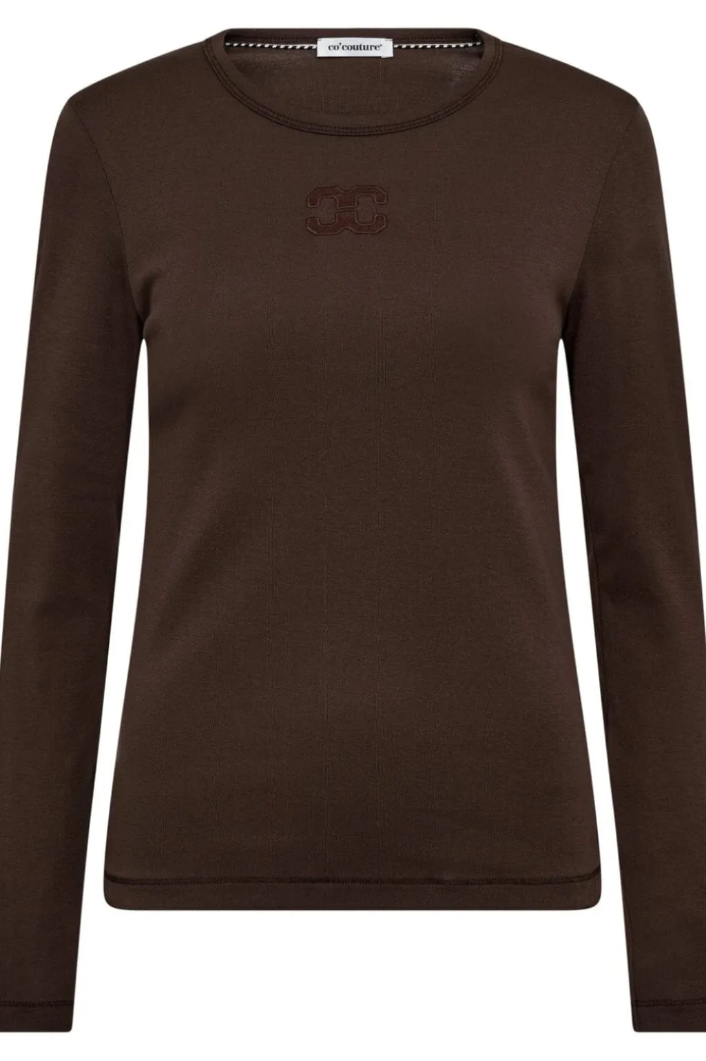Langærmet t-shirt fra Co´Couture i mørkebrun. Blusen har et broderet logo på brystet og dekorative syninger.