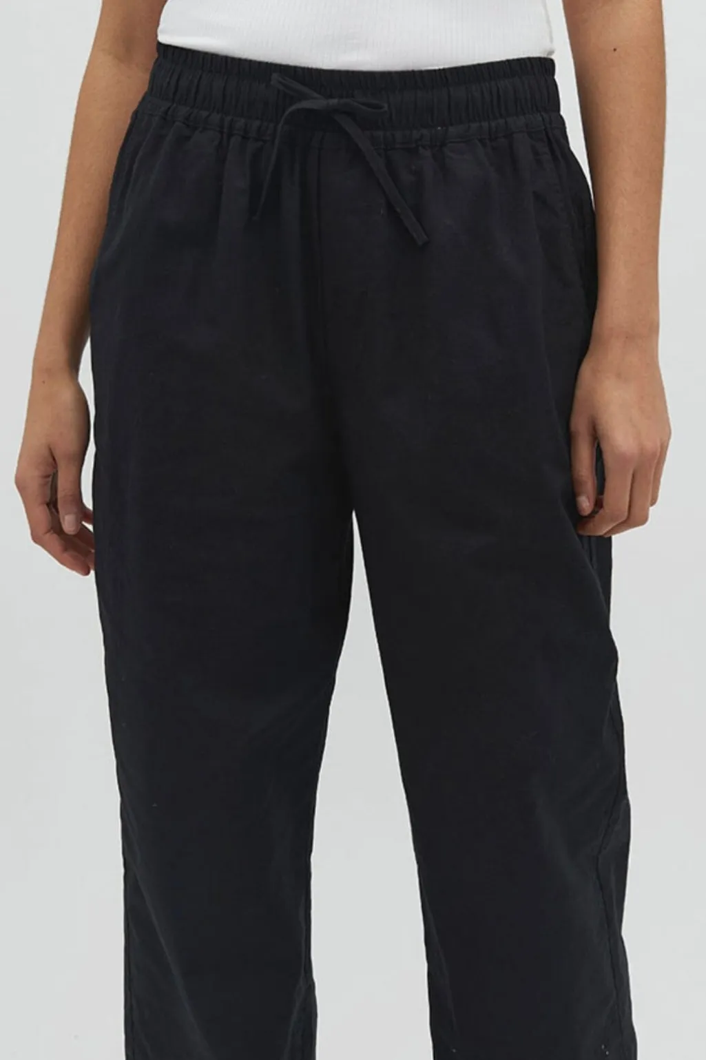 Sorte bukser fra MbyM med afslappet pasform og ankellængde. Bukserne har en elastisk talje med snørelukning og er lavet af en blanding af bomuld og hør.