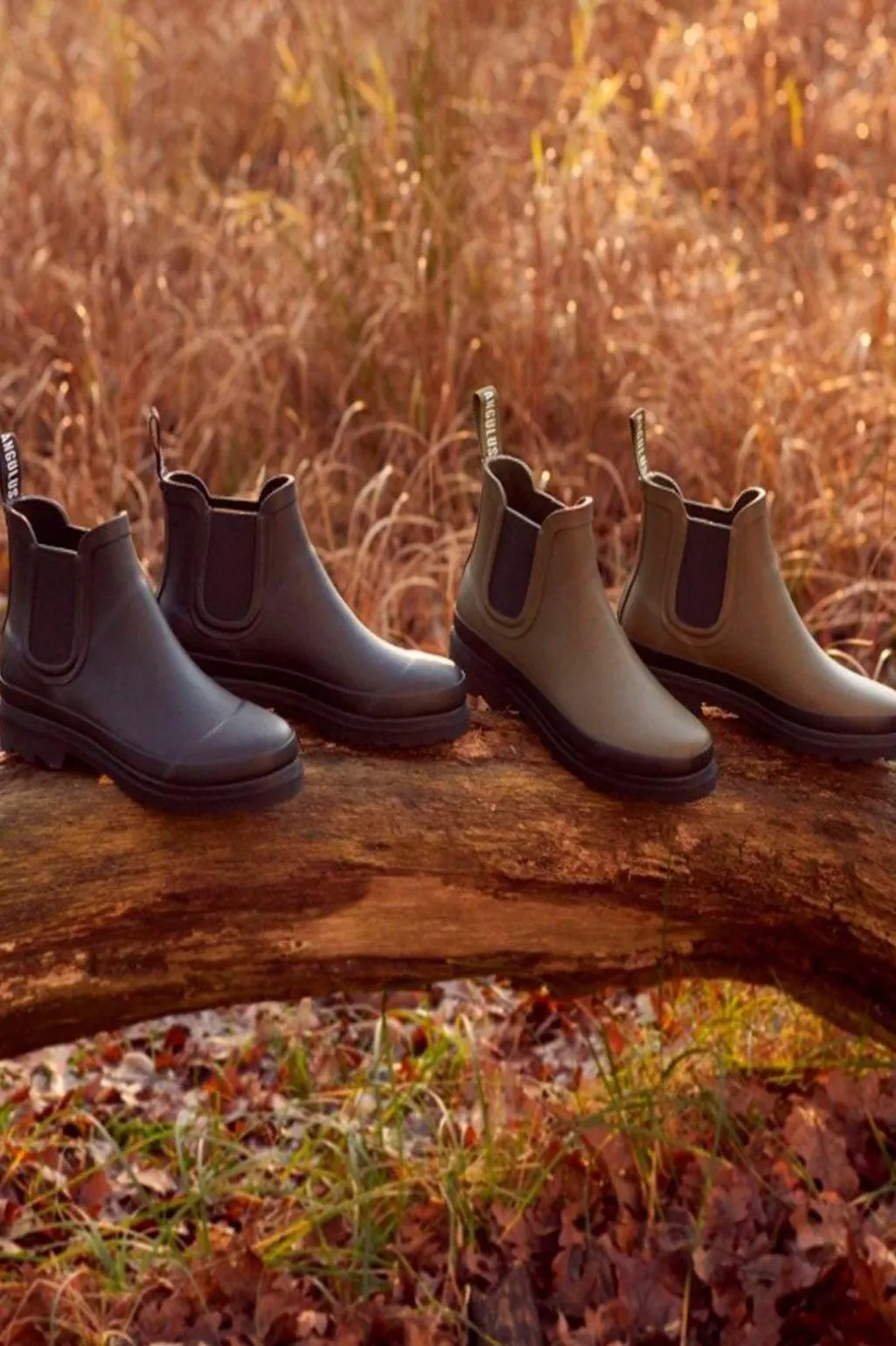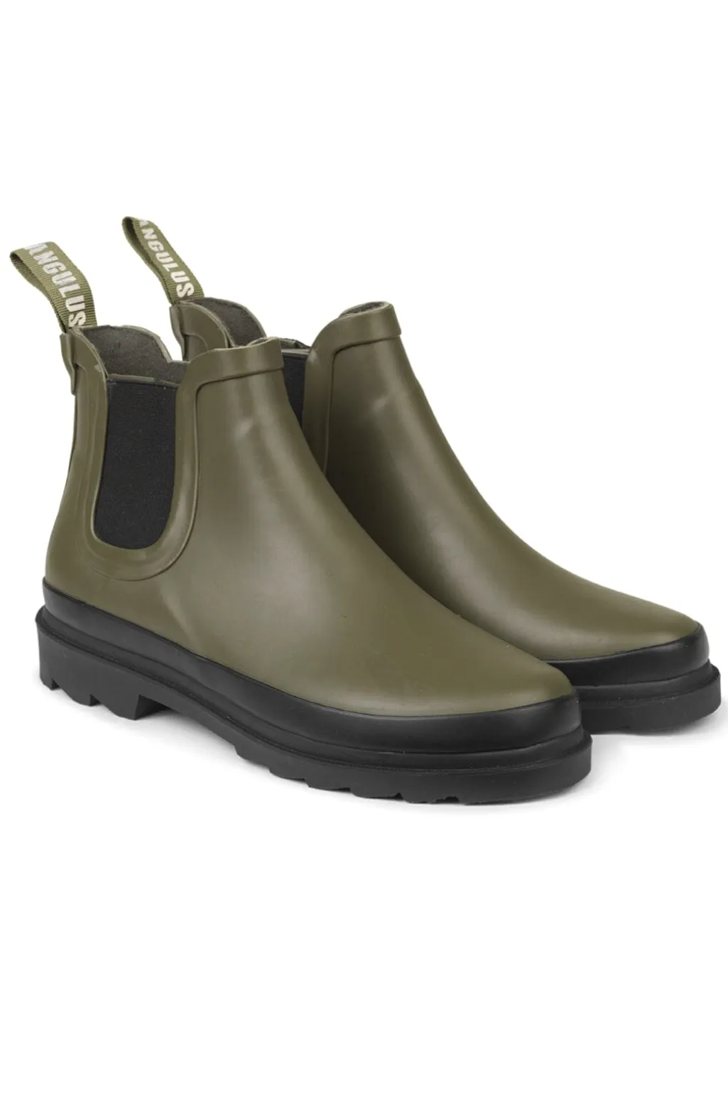 Super lækre ankel gummistøvler i oliven grøn fra Angulus med elastik i siderne. Der medfølger en army farvet pose til med stropper så det er nemt, at opbevare sine gummistøvler.