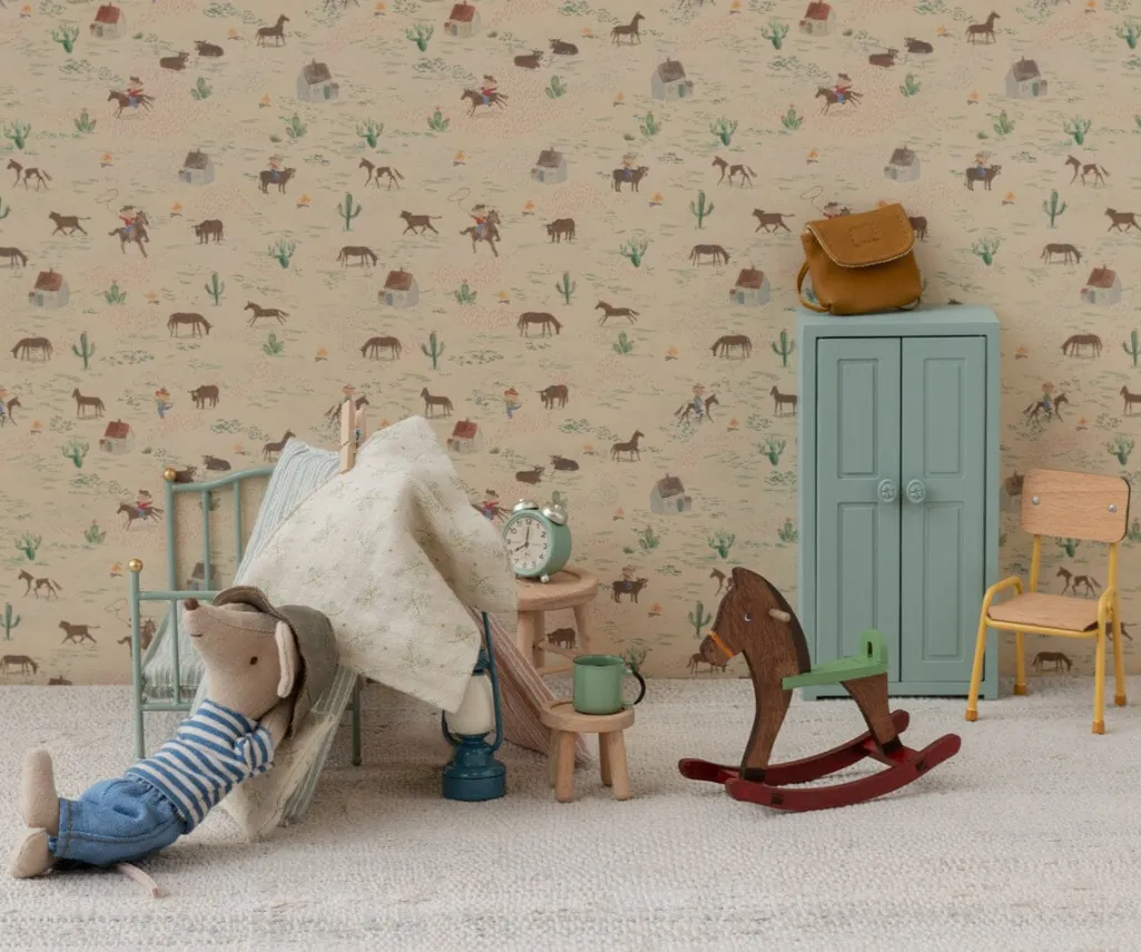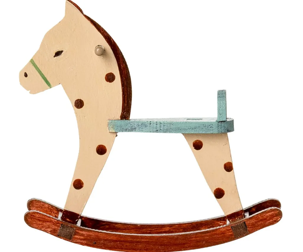 En gyngehest i træ fra Maileg, designet til Maileg-mus i størrelsen Big Sister/Brother. Gyngehesten er i lysebeige træ med et prikket mønster i brune nuancer.