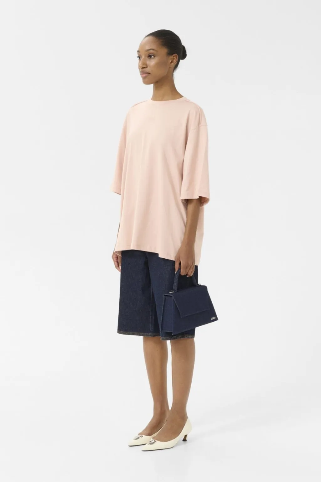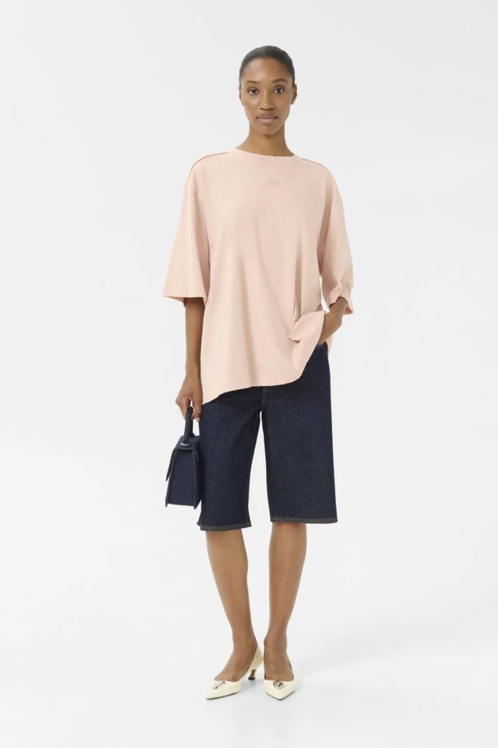 T-shirt fra Gestuz i en lys rosa nuance. Den har en broderet detalje på brystet og en rund halsudskæring med korte ærmer.