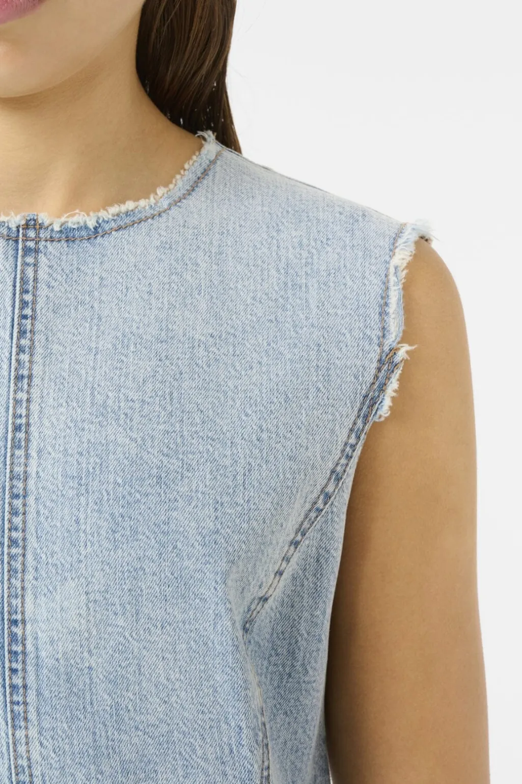 Kort denimkjole fra Gestuz i lys blå denim med synlige sømme og acid wash-effekt. Kjolen har rund halsudskæring og ærmeløst design.
