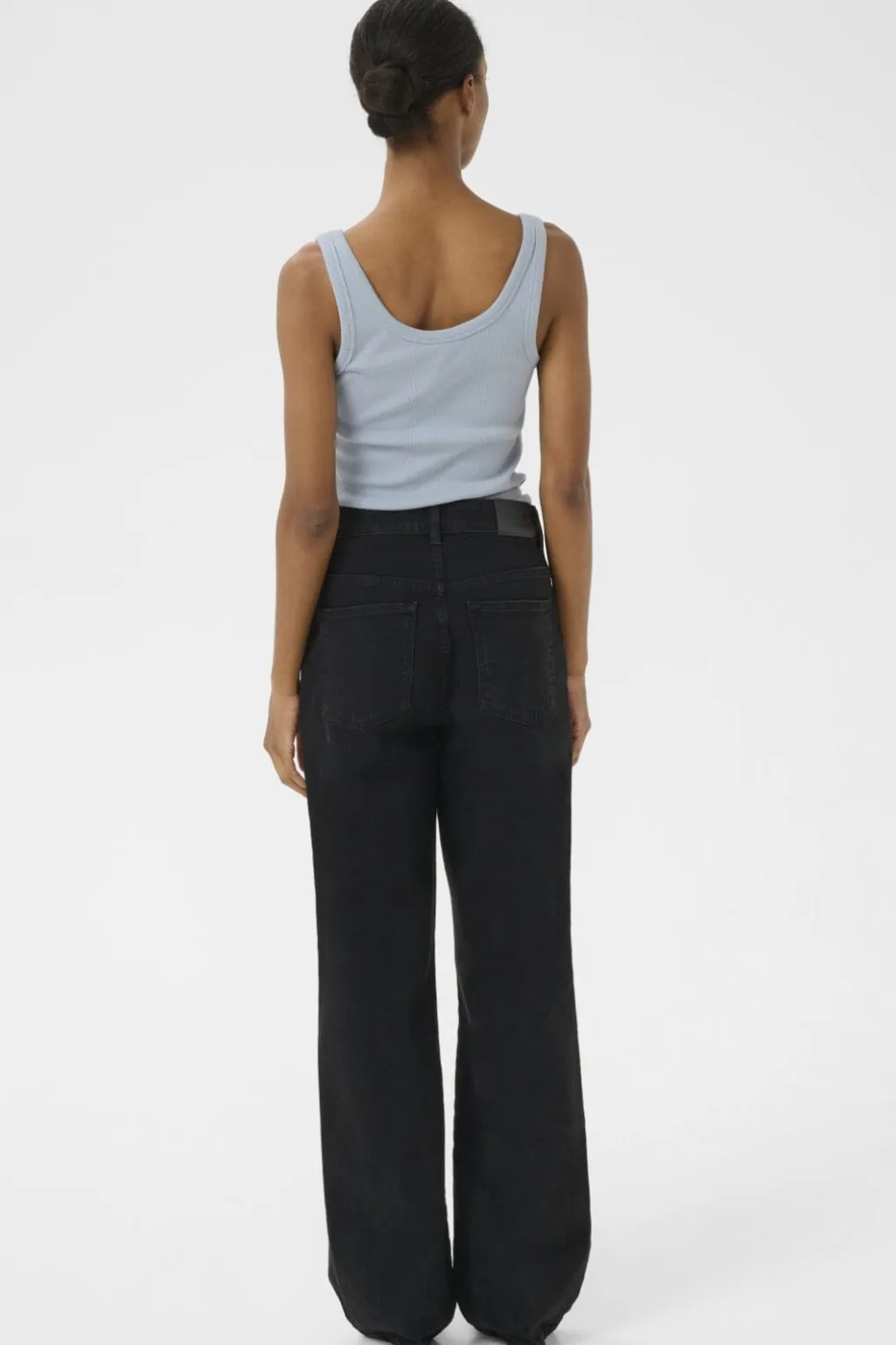 Gråblå tanktop fra Gestuz i ribstrik med rund halsudskæring. Den ærmeløse top har et broderet logo på fronten og en tætsiddende pasform.