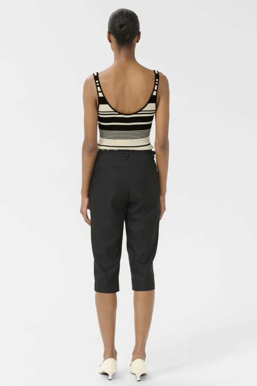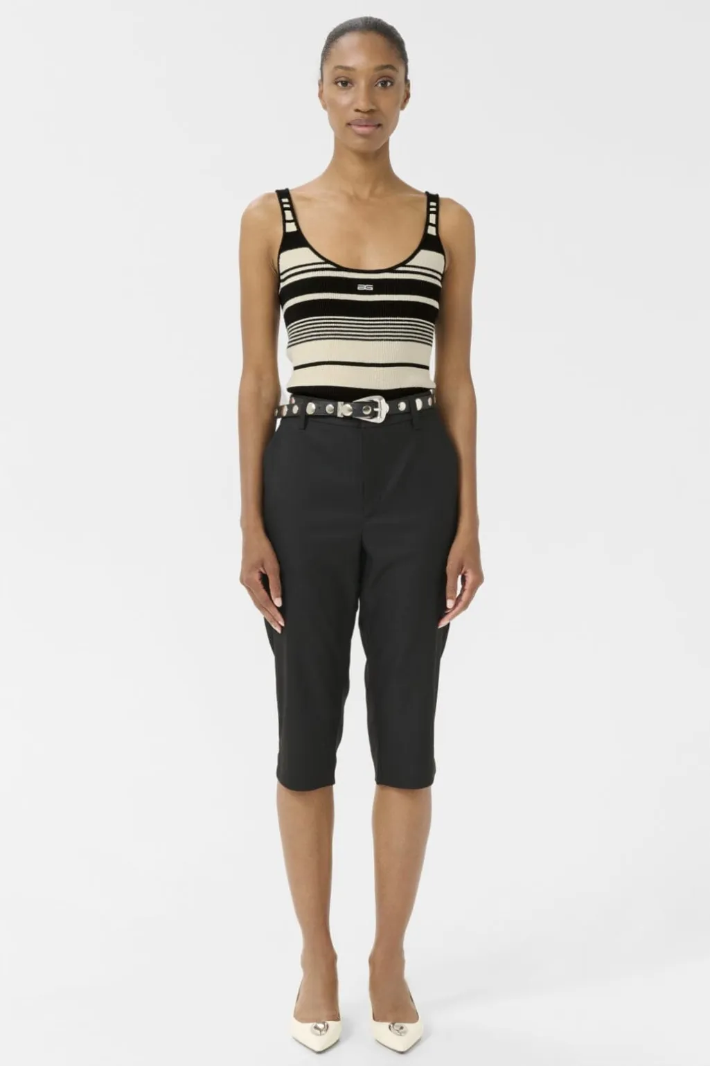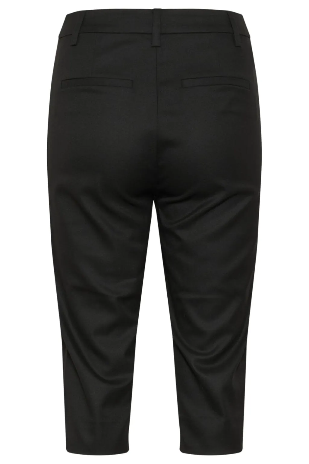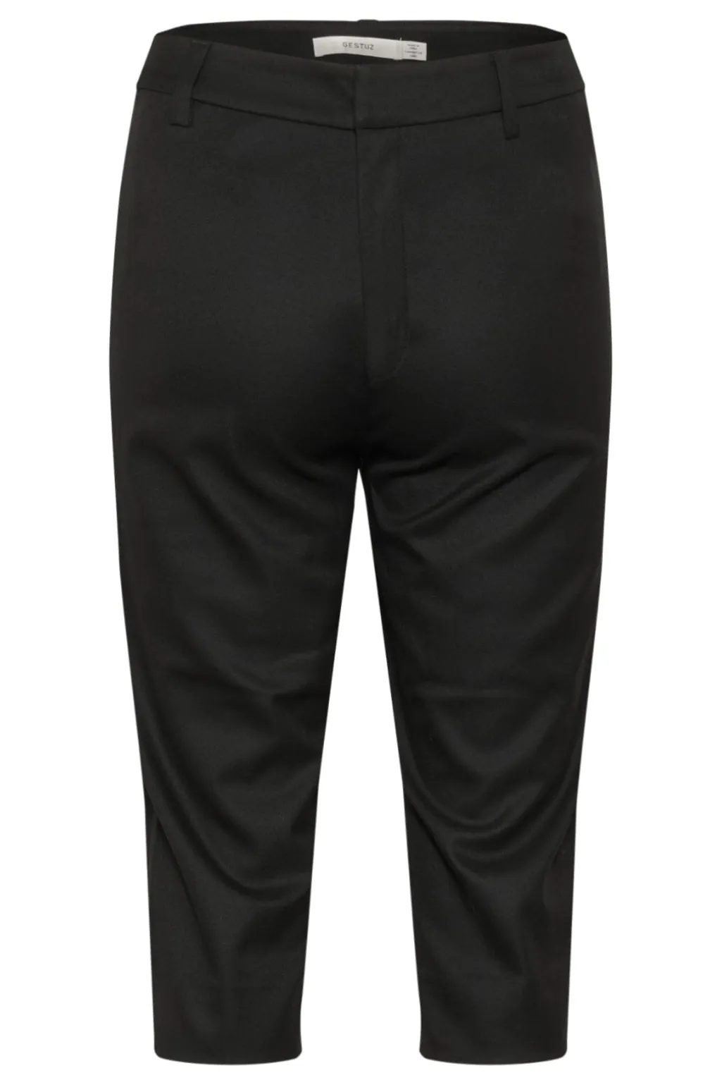 Sorte capribukser fra Gestuz med en regulær pasform. Bukserne har en længde til midt på læggen og er fremstillet i en blanding af genanvendt polyester, viskose og elastan.