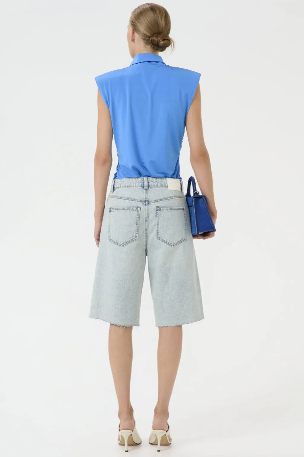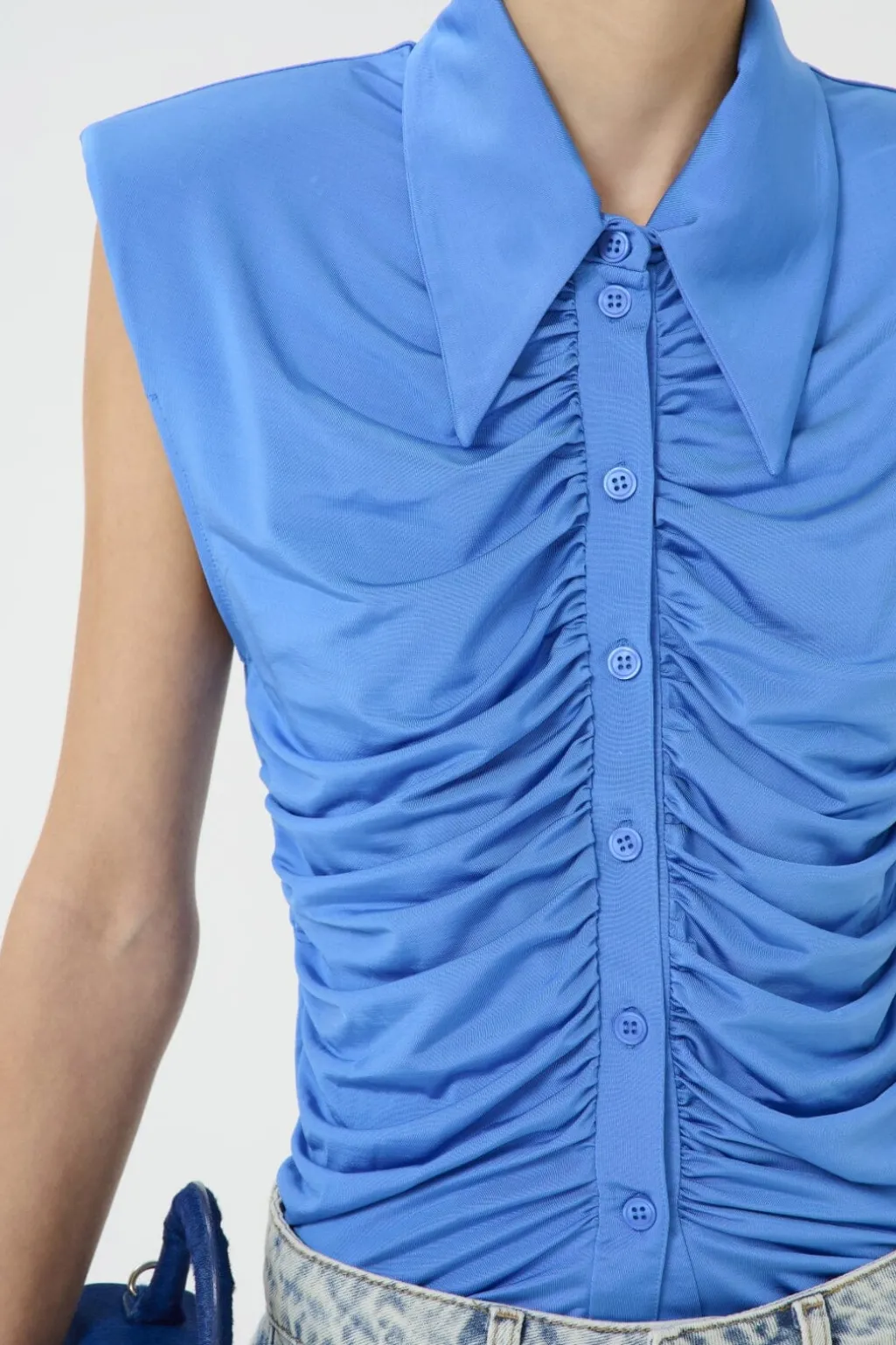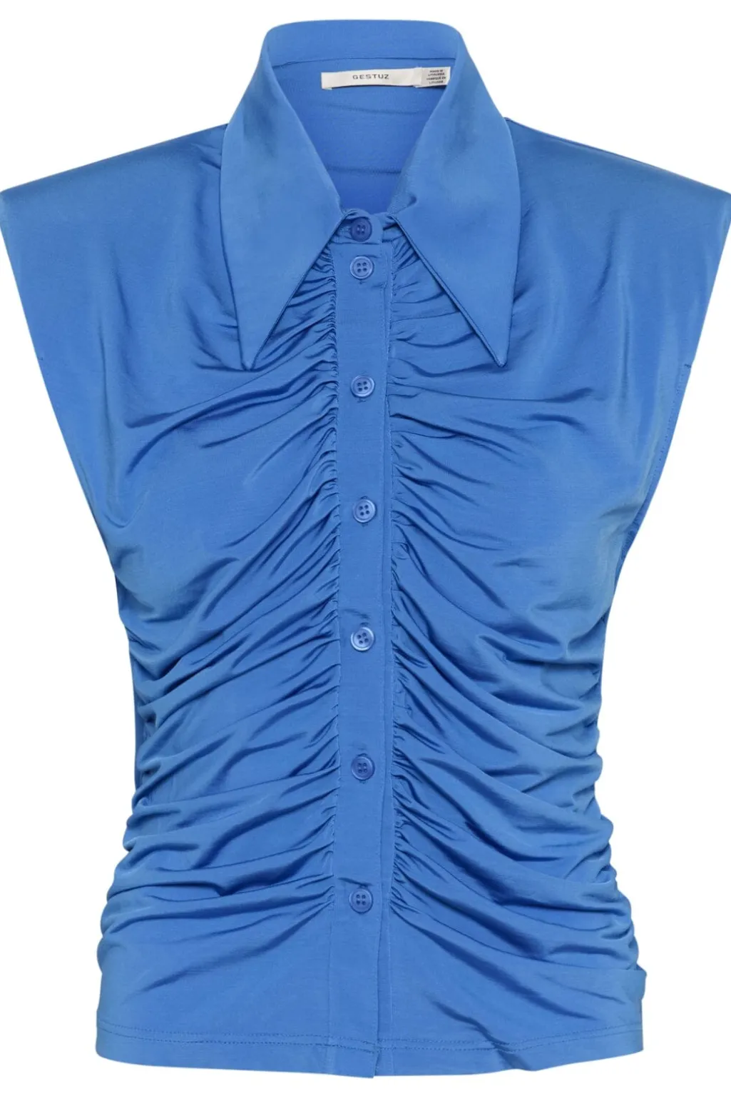 Blå skjorte fra Gestuz med rynkedetaljer langs forsiden. Den har spidse skjortekraver og brede kapærmer, der giver et luftigt design.
