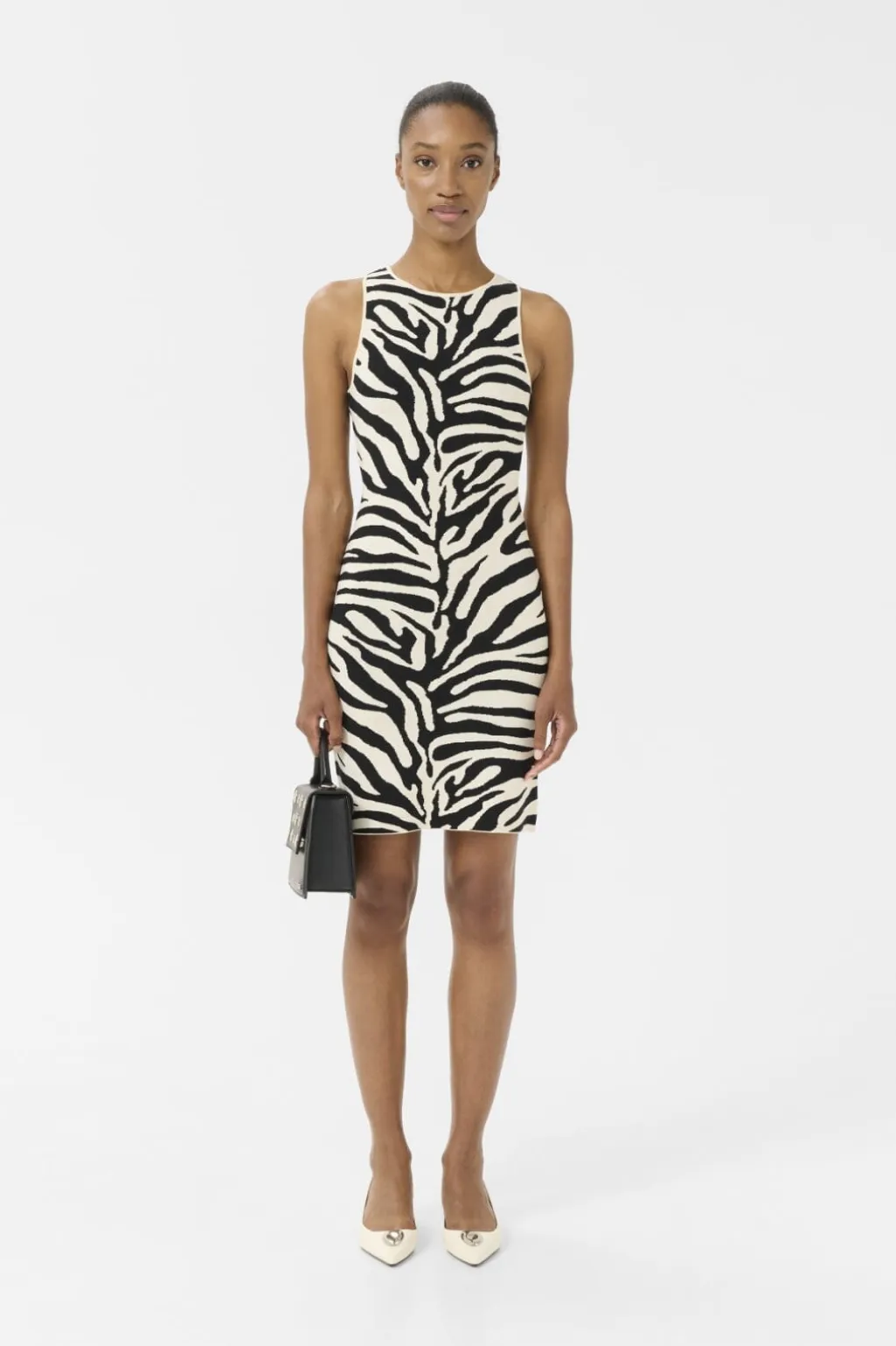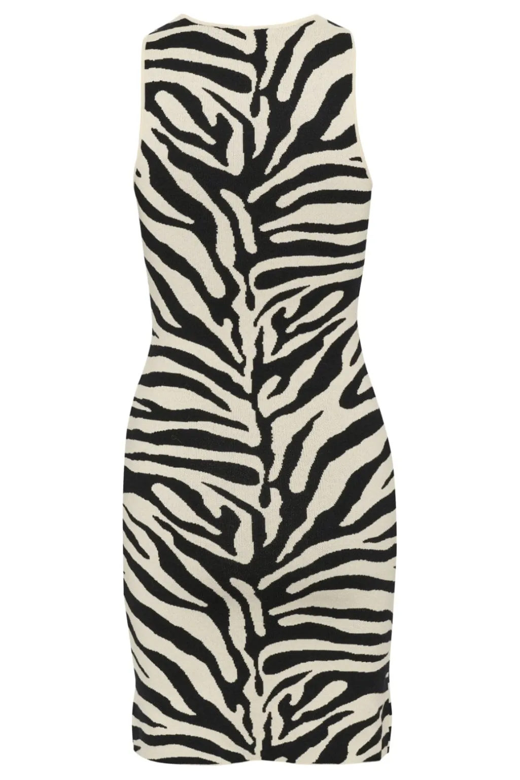 Ærmeløs kjole fra Gestuz med zebraprint i sort og birch. Den har en rund halsudskæring og en lige silhuet, der går til midt på låret.