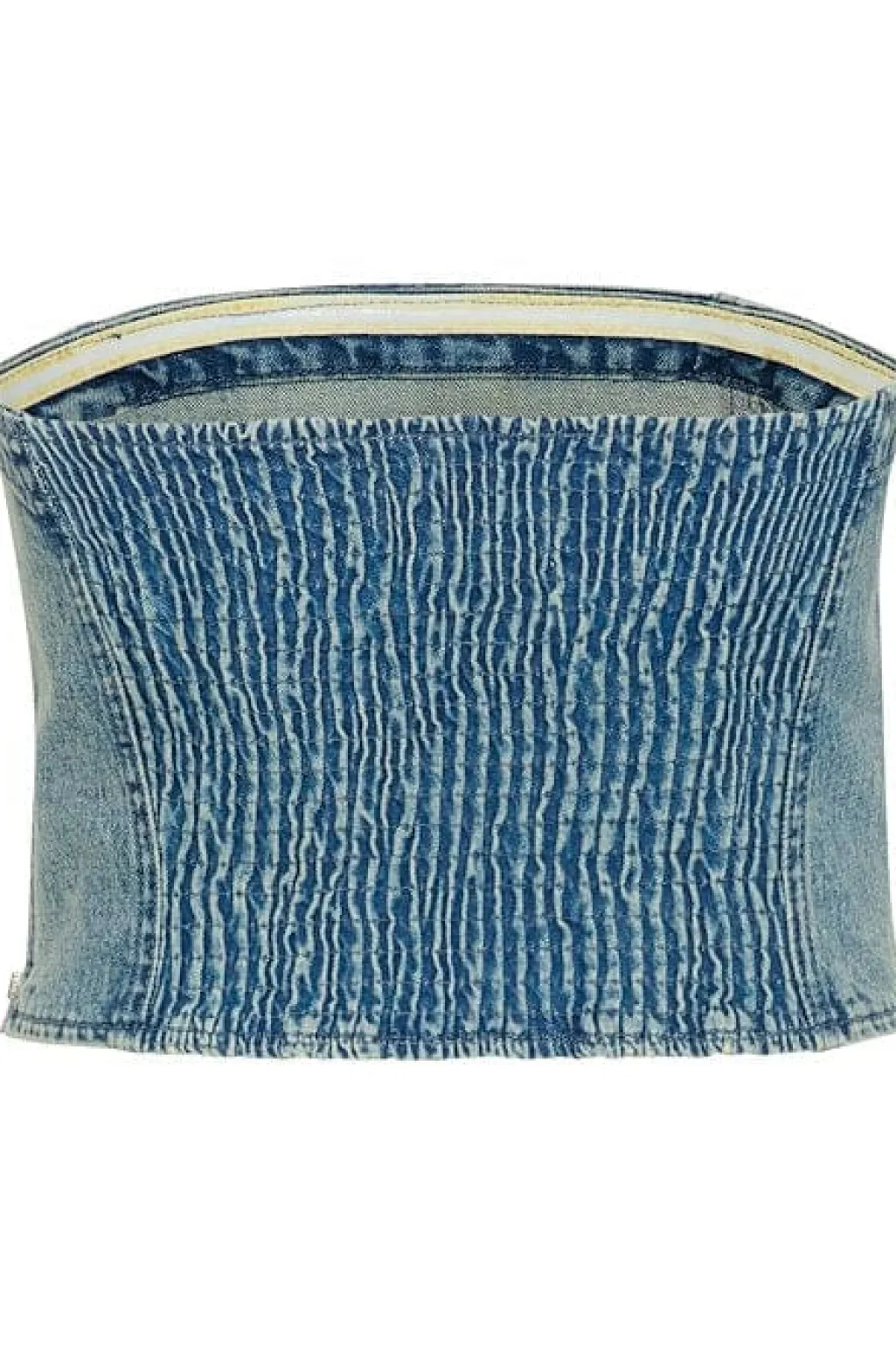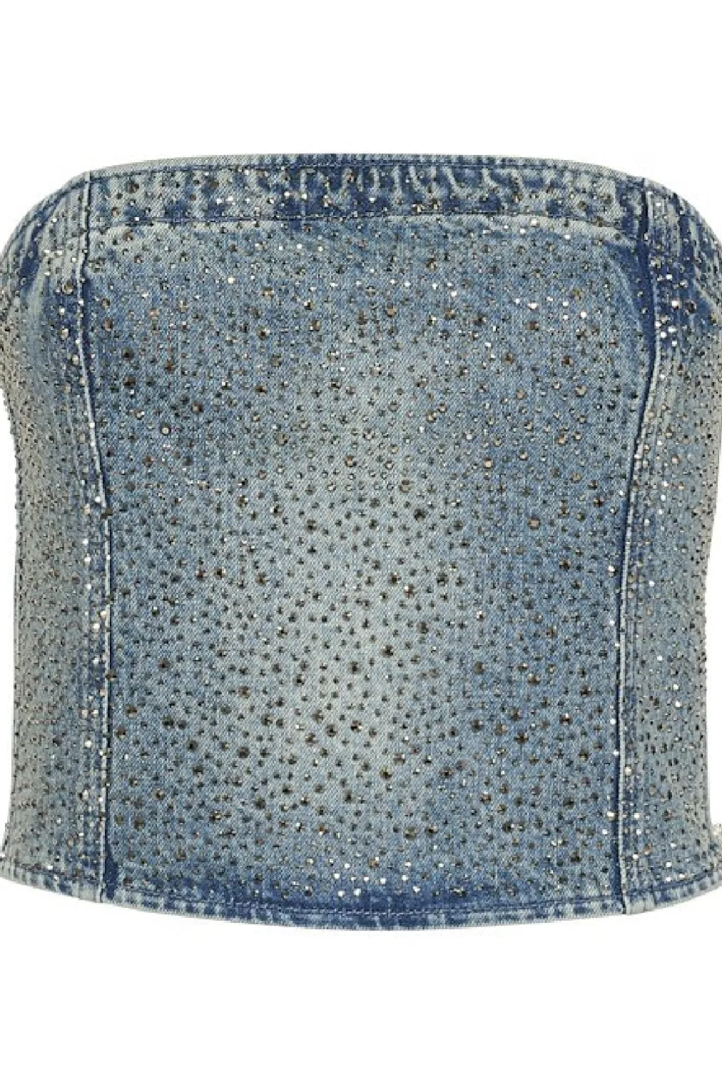 Denimcorsage fra Gestuz i lysblå acid wash. Den stropløse top har pailletter og flæser, som giver den et festligt udtryk. Designet til særlige anledninger med en kombination af rå denim og glimtende detaljer.