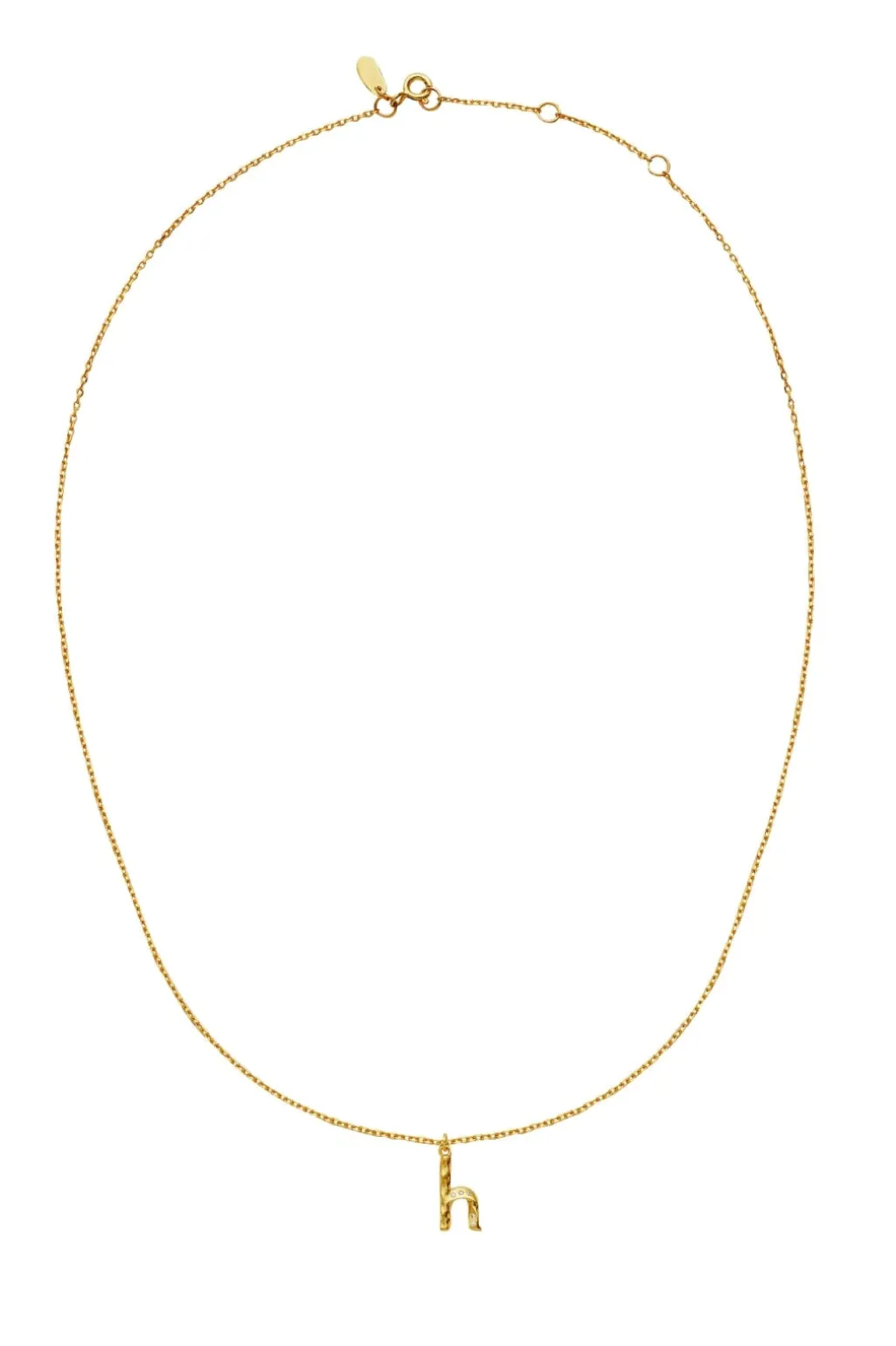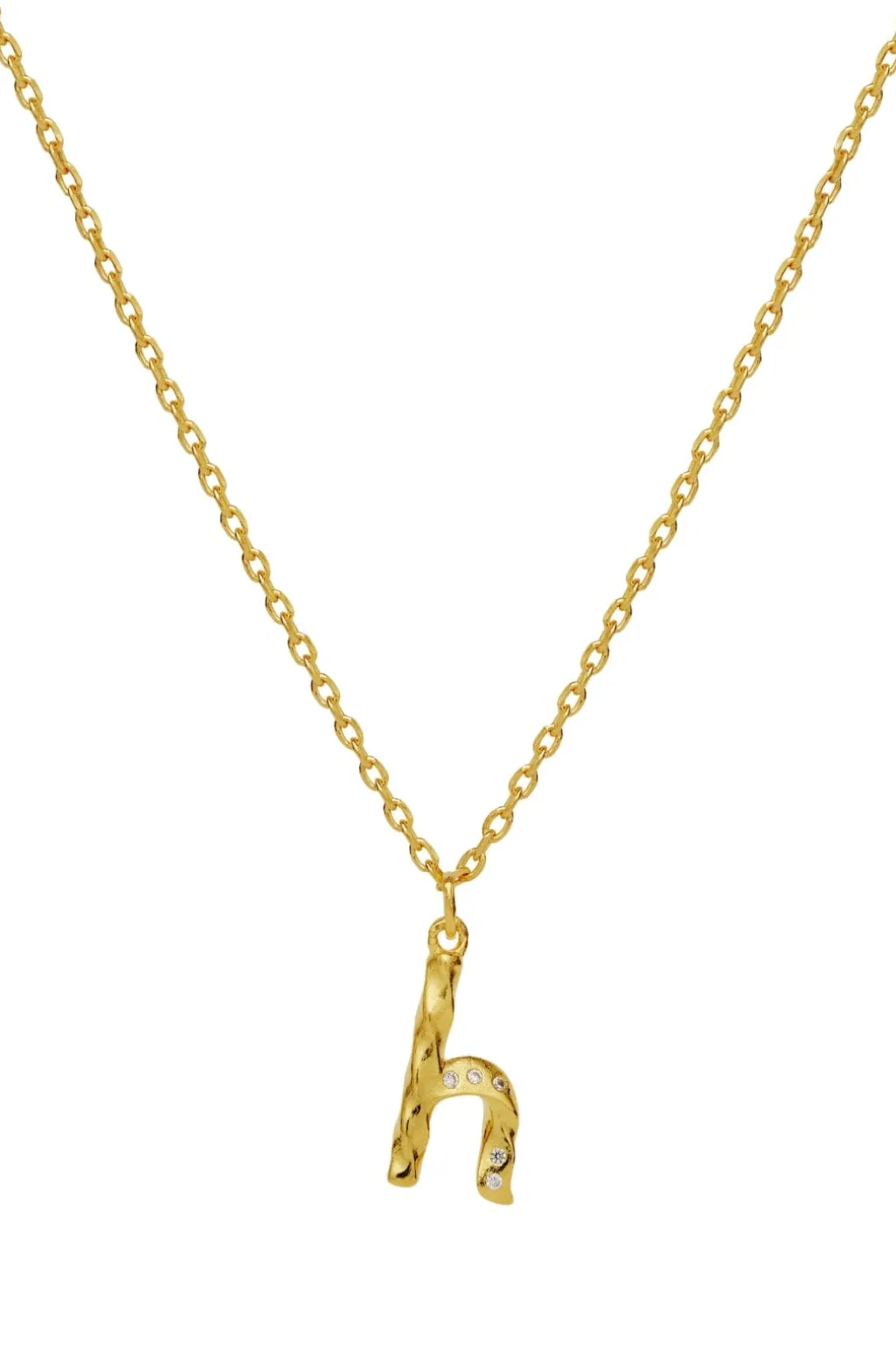 Guldbelagt halskæde fra Maanesten med et h-formet vedhæng. Vedhænget har en struktureret overflade med små dekorative sten og sidder på en fin kæde med linkdesign.