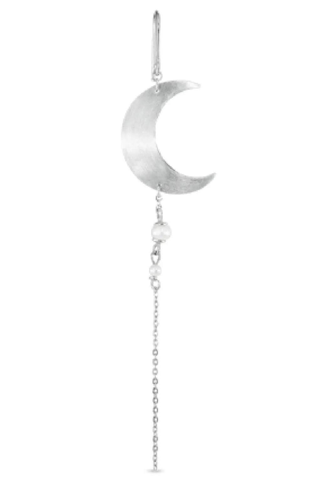 Halvmåneformet ørering fra Jane Kønig med perlekæde til højre øre. Øreringen er lavet af sterling sølv og har et rent, enkelt design med perler på en fin kæde.