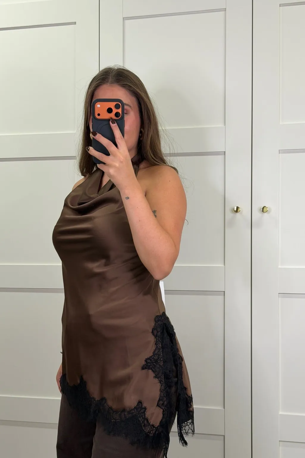 Halterneck-top fra Dear Molly i brun farve. Toppen har blondekant langs kanten og en draperet halsudskæring i halterneck-stil.