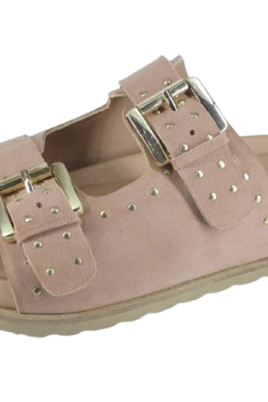 Pink sandal fra Copenhagen Shoes med to justerbare remme. Sandalen har en flad sål og er fremstillet i læder med dekorative nitter langs remmene og metalspænder.