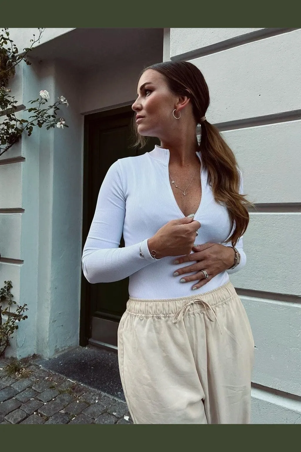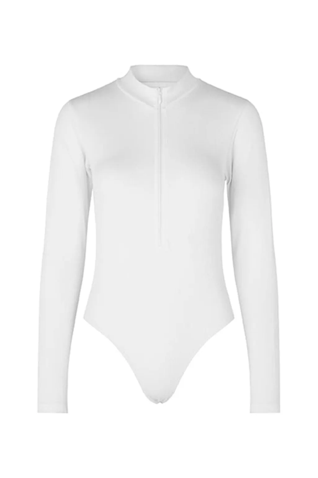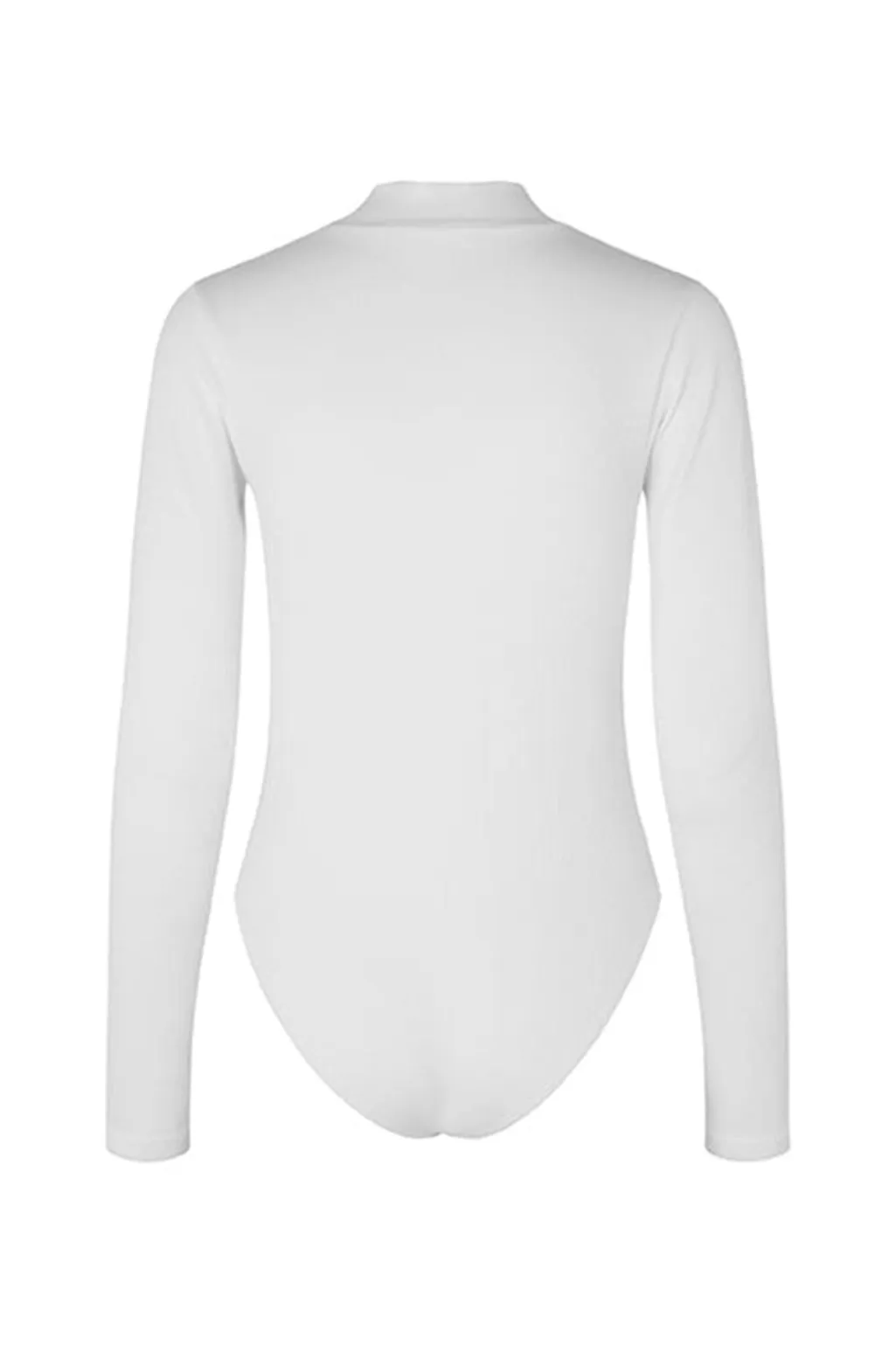 Hvid bodystocking fra Lykkeland Ateliér med høj krave og lange ærmer. Den tætsiddende model har lynlås foran og et højt snit ved både forben og bagben.
