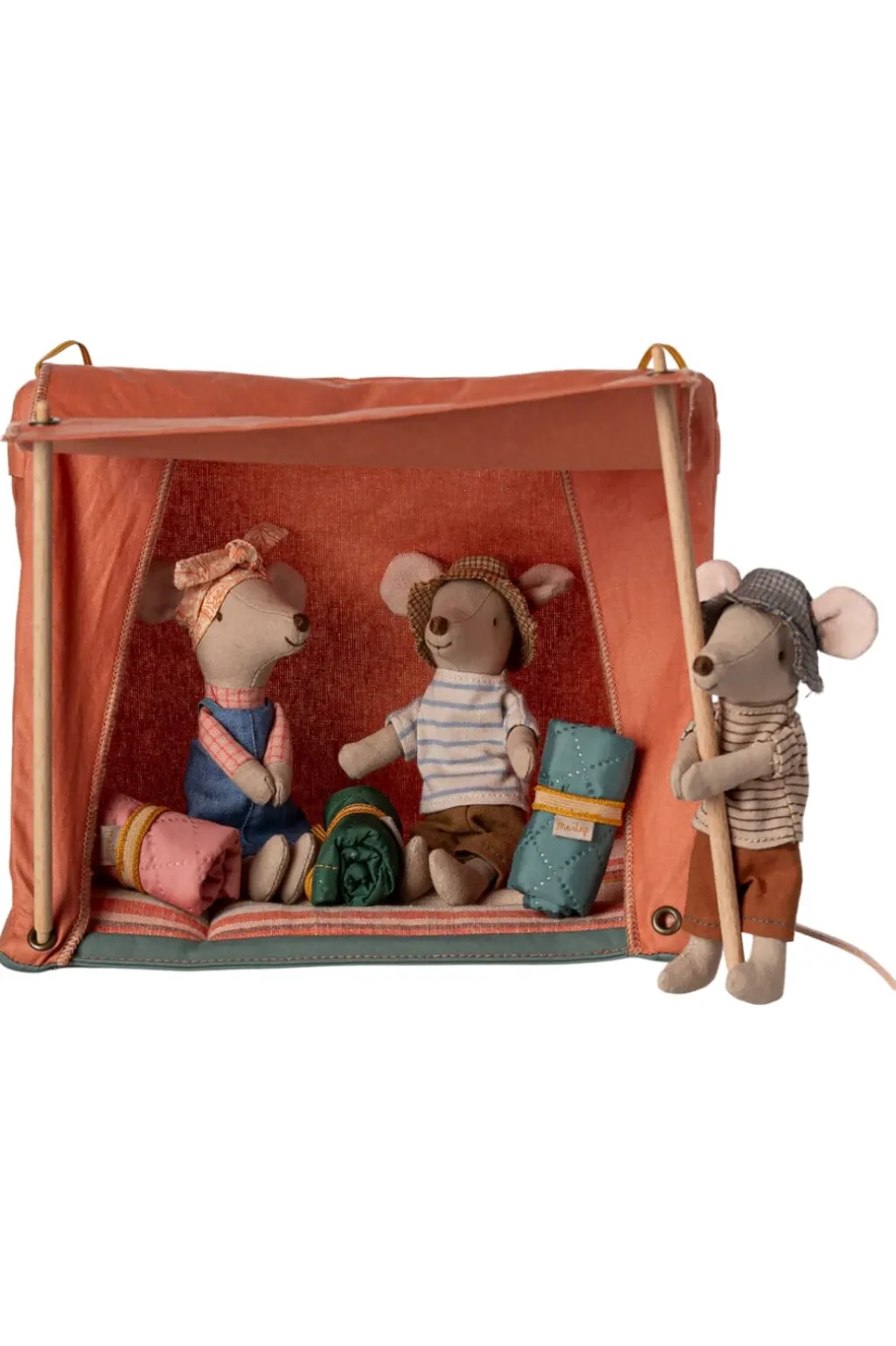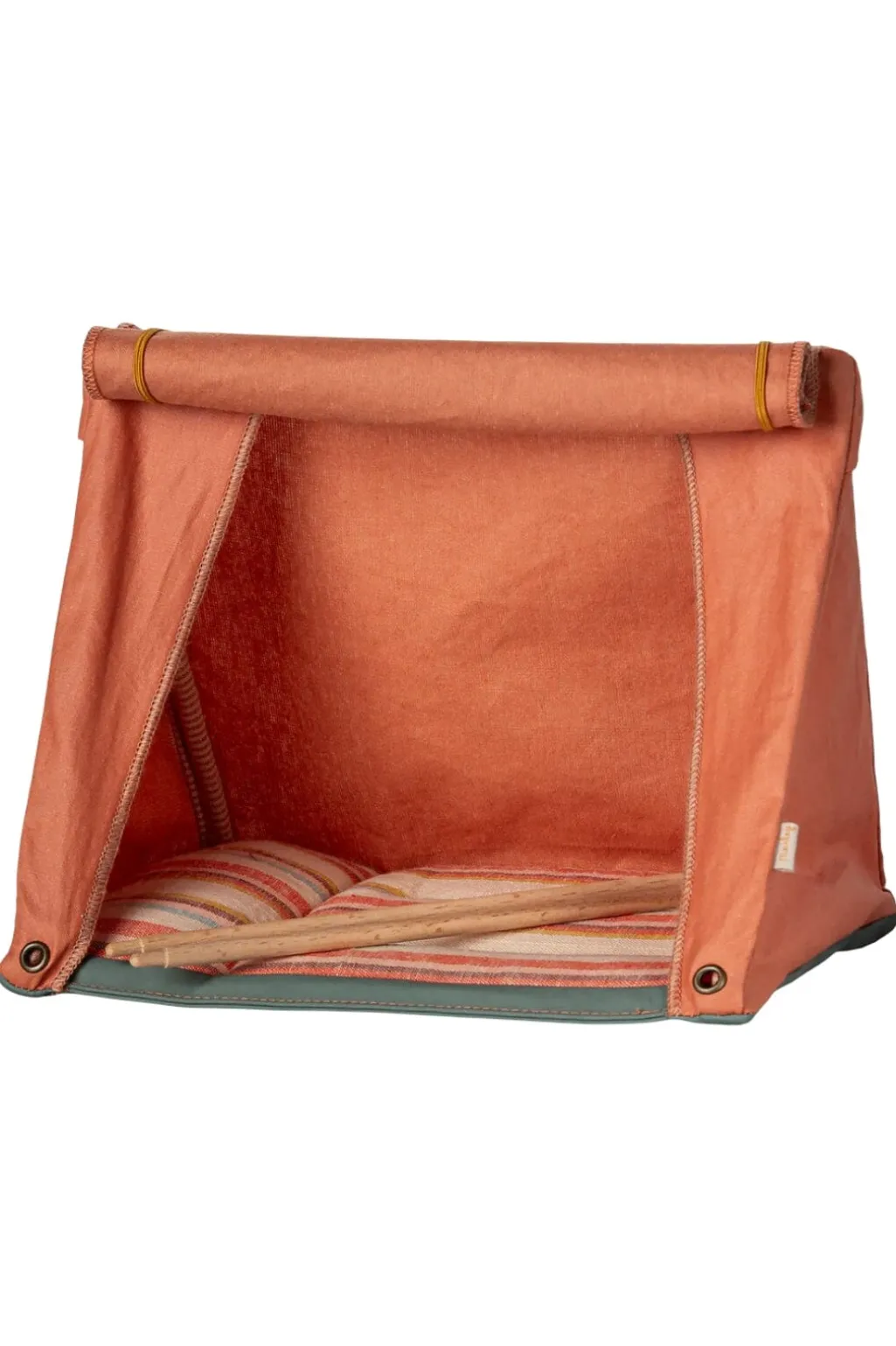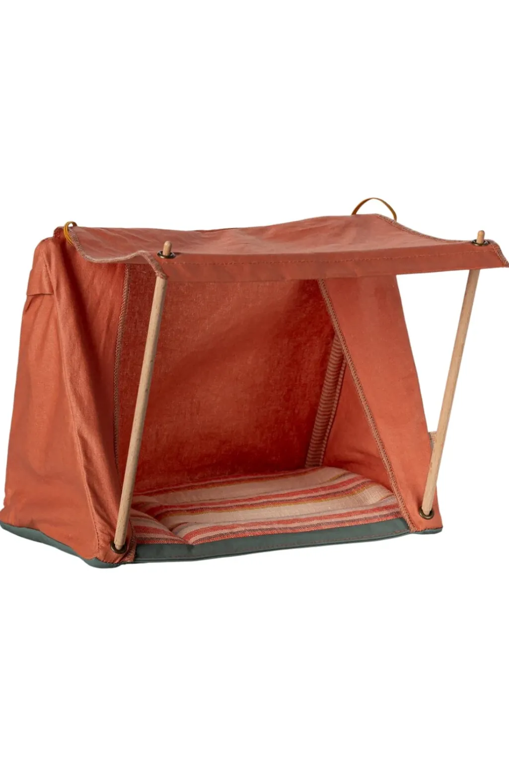 Et orange legetøjstelt fra Maileg med foldbart design og træpinde. Den stribede pude indeni og det praktiske design gør teltet til et godt sted for legetøjsmus at bo.
