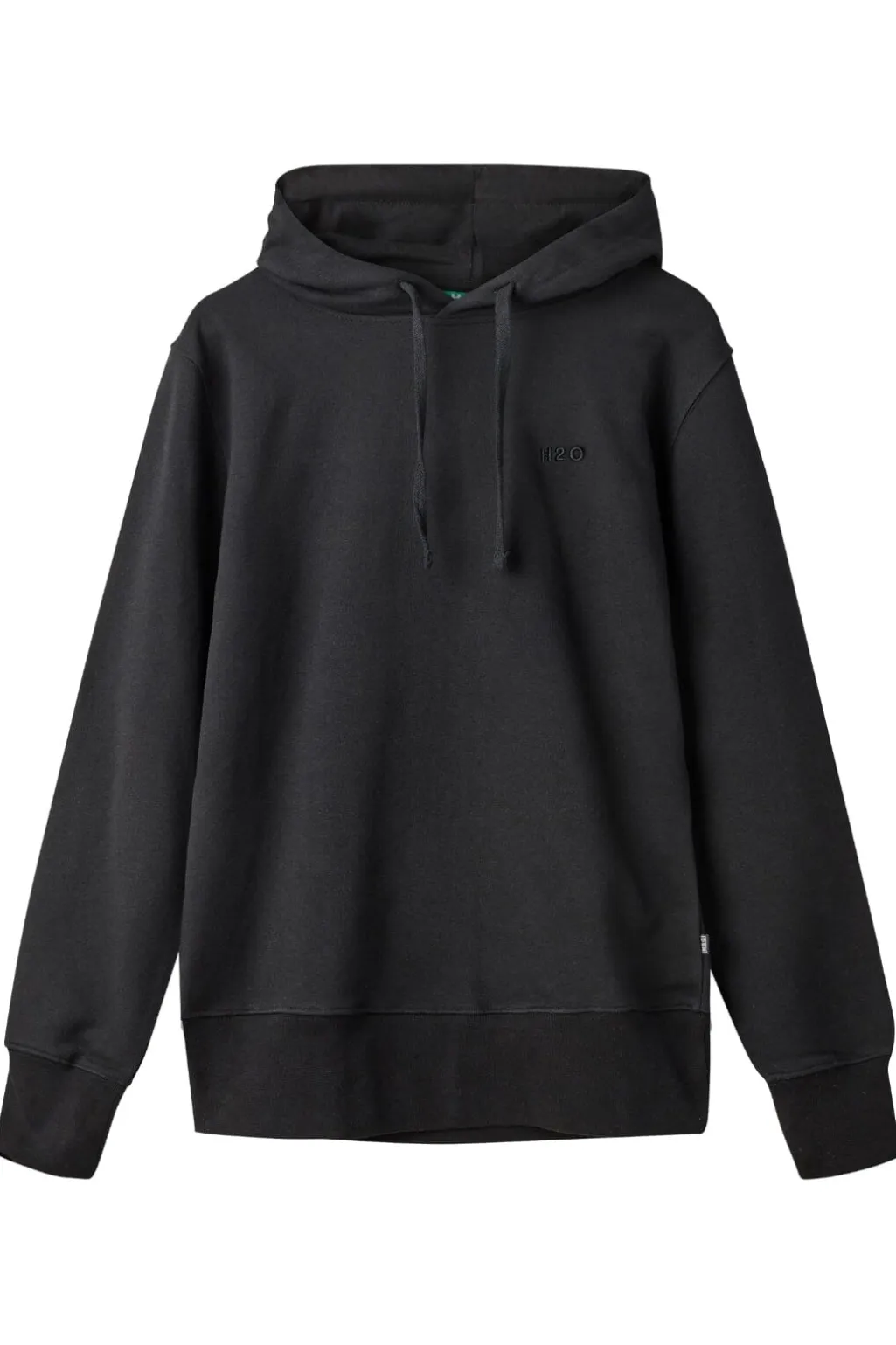 Sort hættetrøje fra H2O med broderet logo på brystet. En alsidig sweatshirt, der kan bruges til både træning og afslapning, med praktiske detaljer som snøre i hætten og ribkanter ved ærmer og søm.