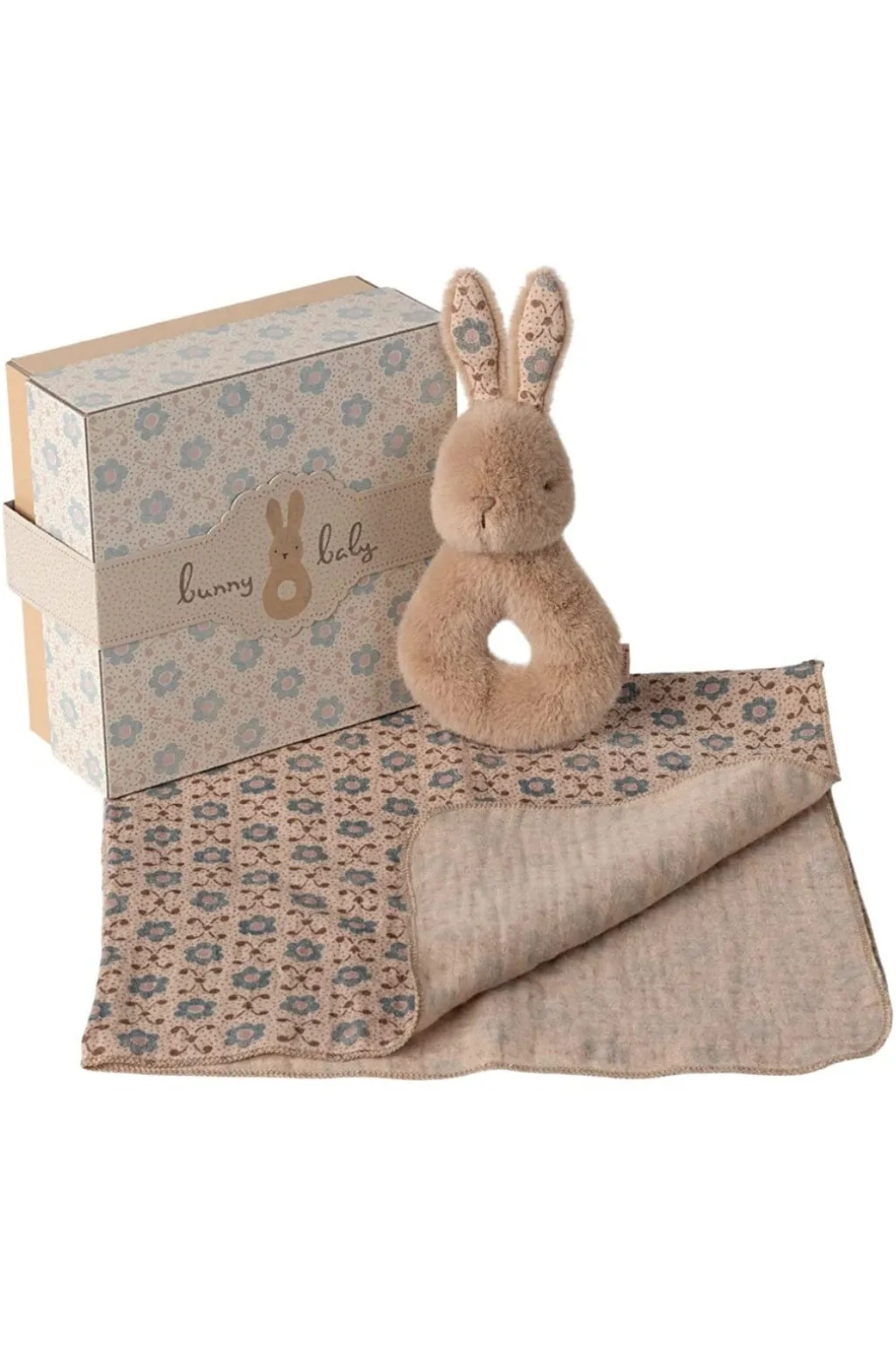 En blød kaninrangle i lys fersken fra Maileg. Ranglen kommer i en dekorativ gaveæske og har blomstermønstrede ører med en indvendig raslelyd.
