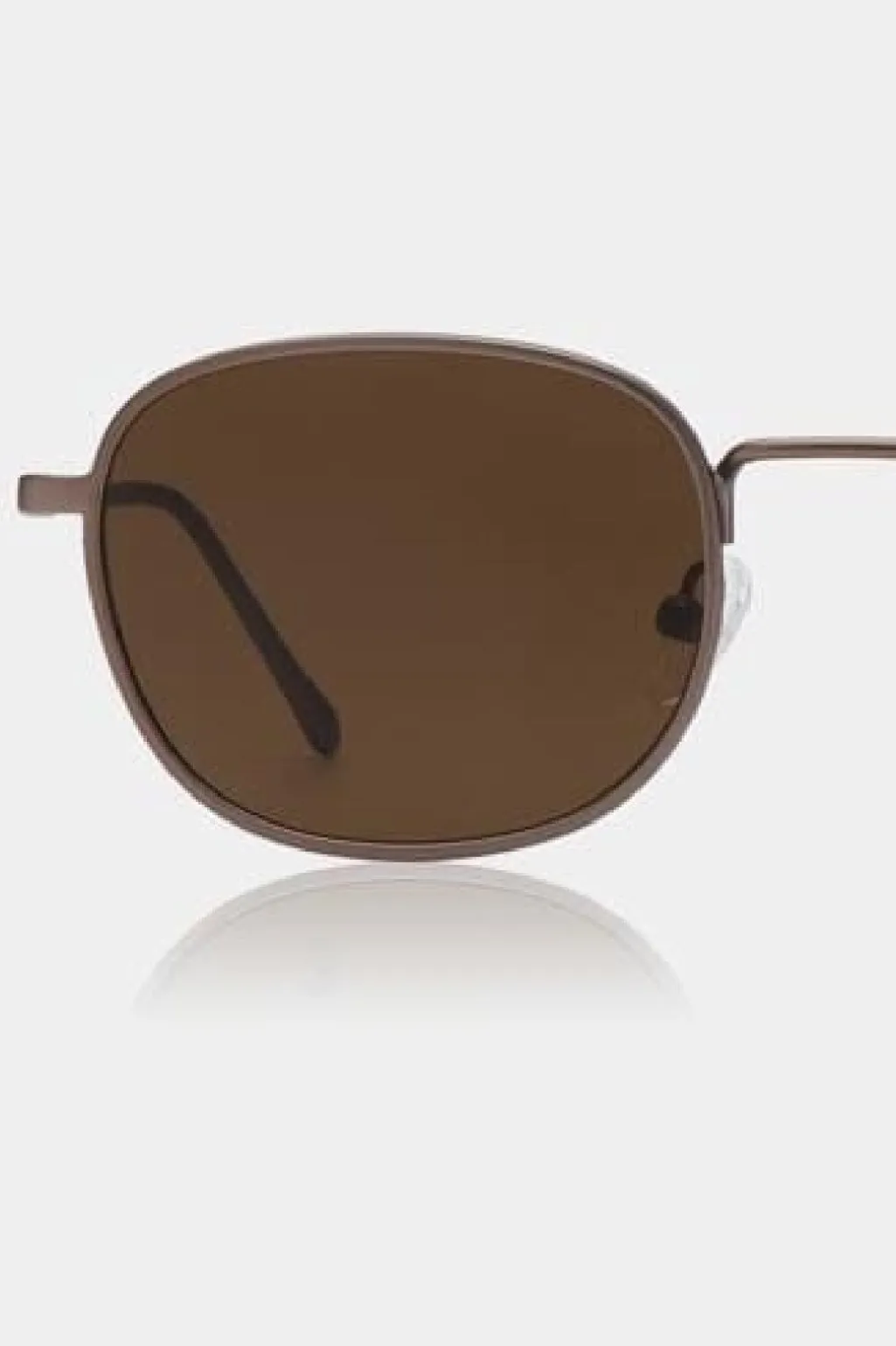 Matbrune solbriller fra A. Kjærbede med oval metalramme. Designet er inspireret af 1960’ernes Hollywood med en slank profil og brune reflekterende linser.