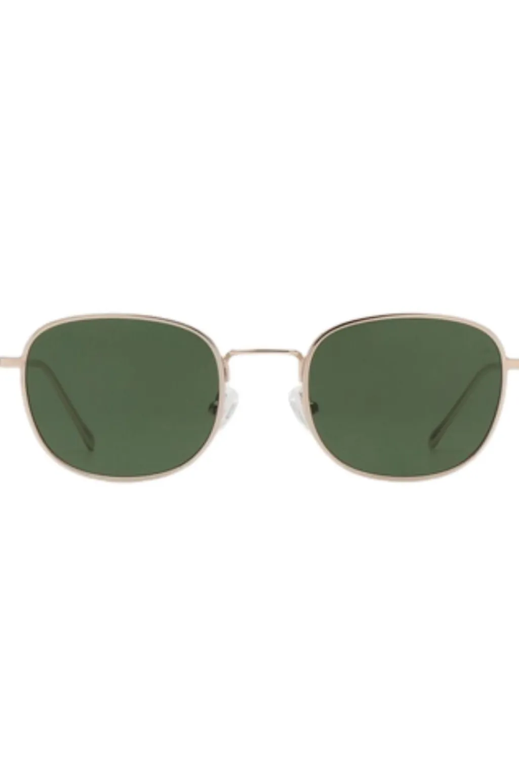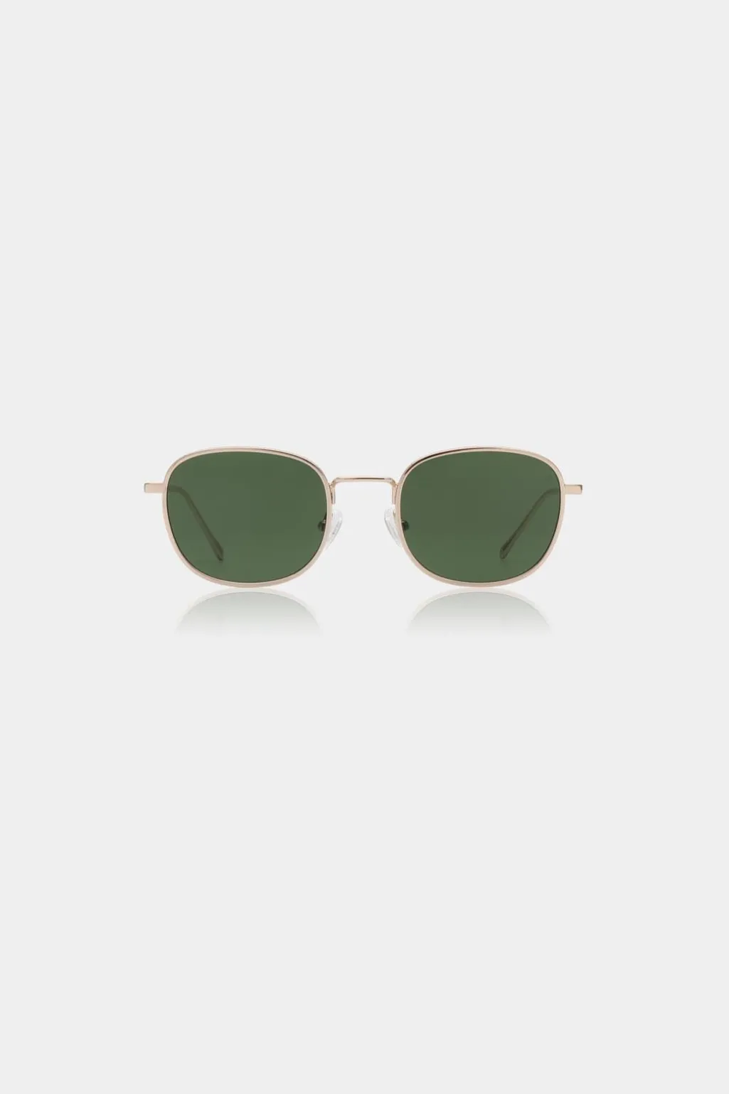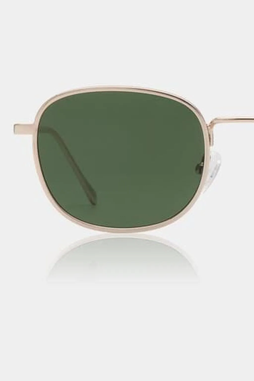 Solbriller fra A. Kjærbede med slanke metalrammer i guld og grønne glas. Brillerne har en rektangulær form inspireret af 60’ernes Hollywood-design.