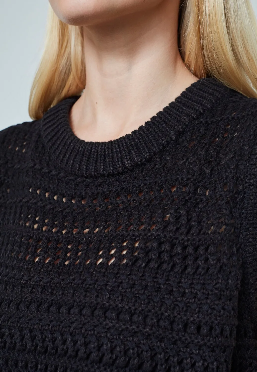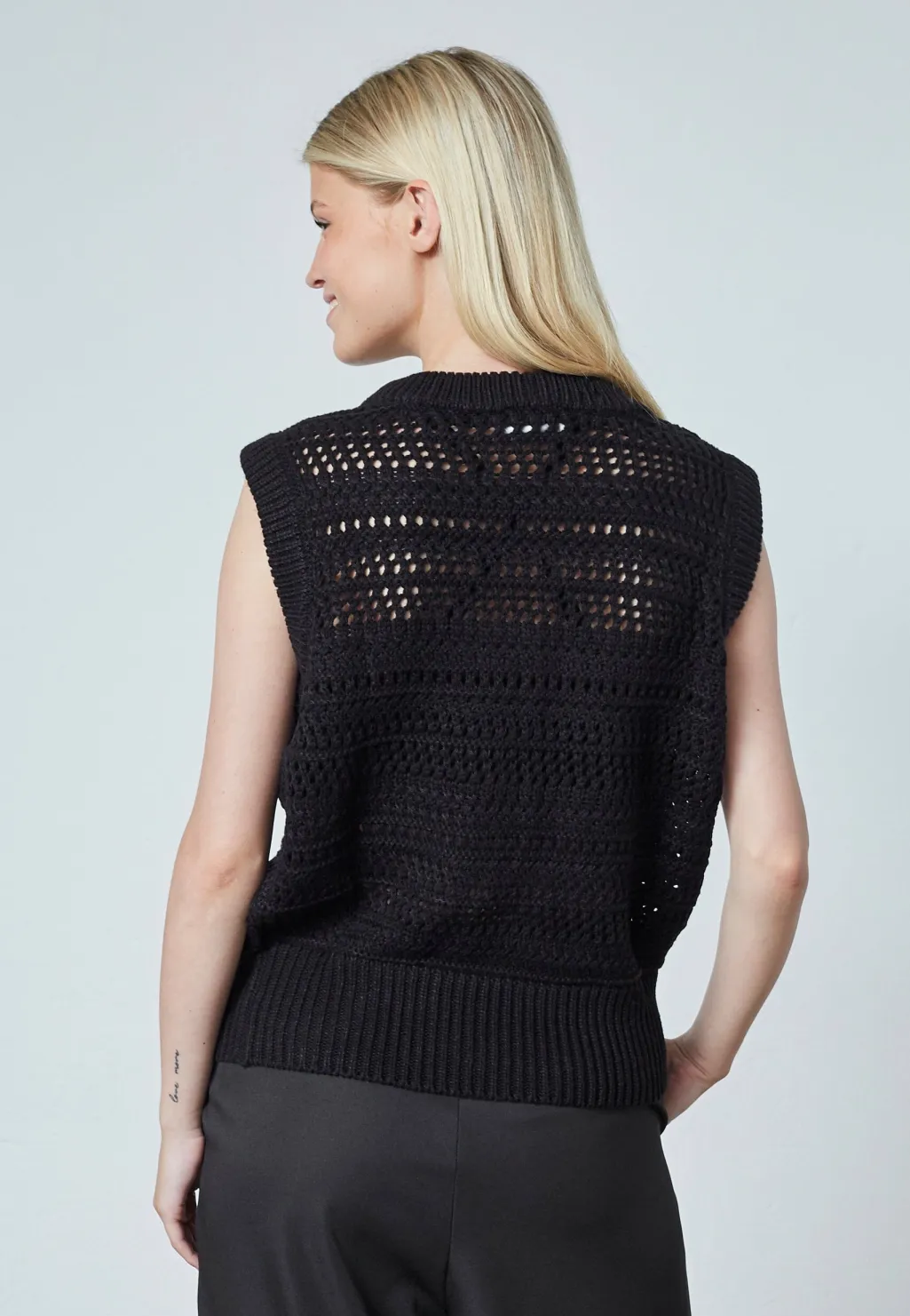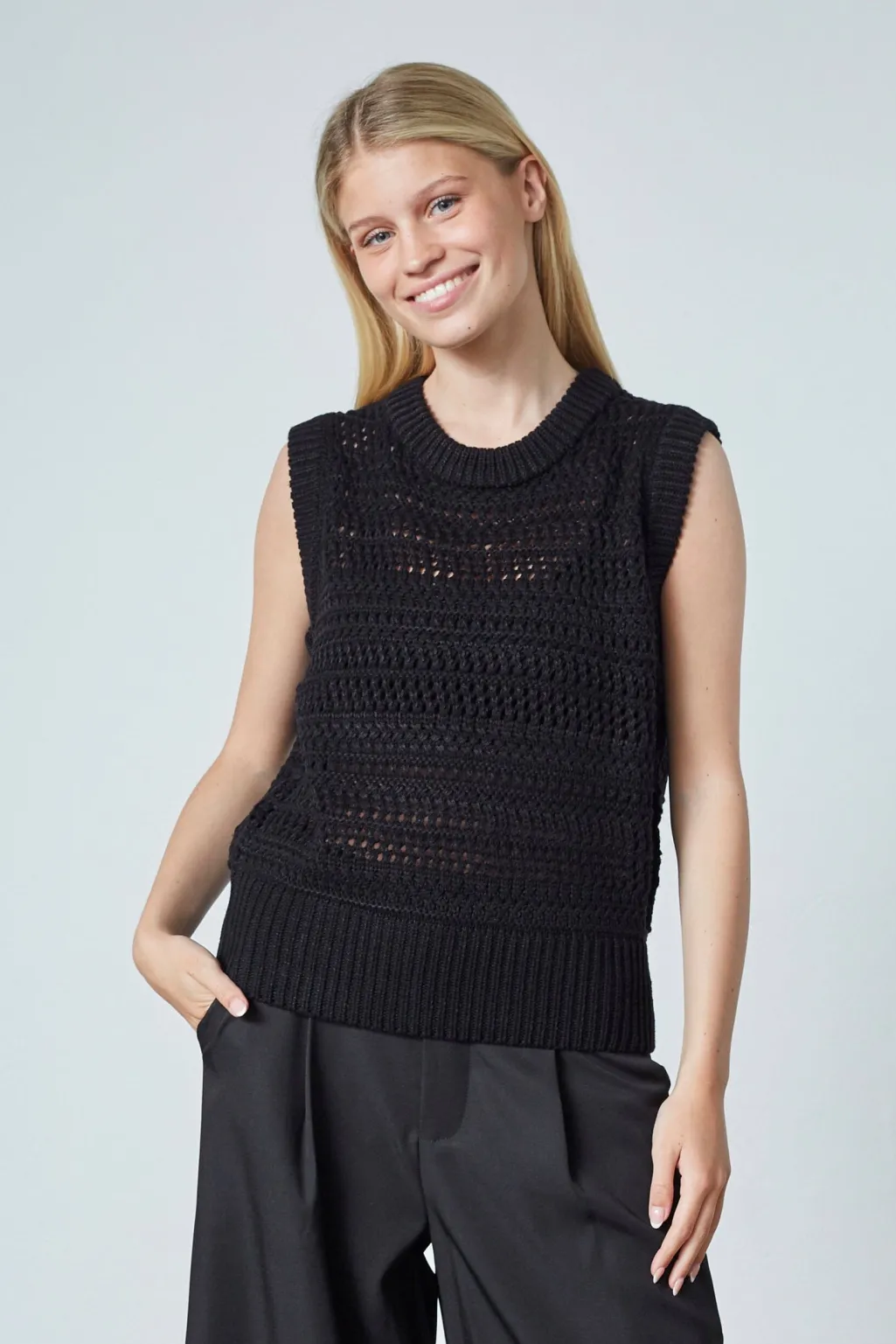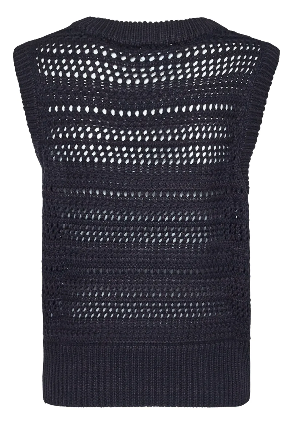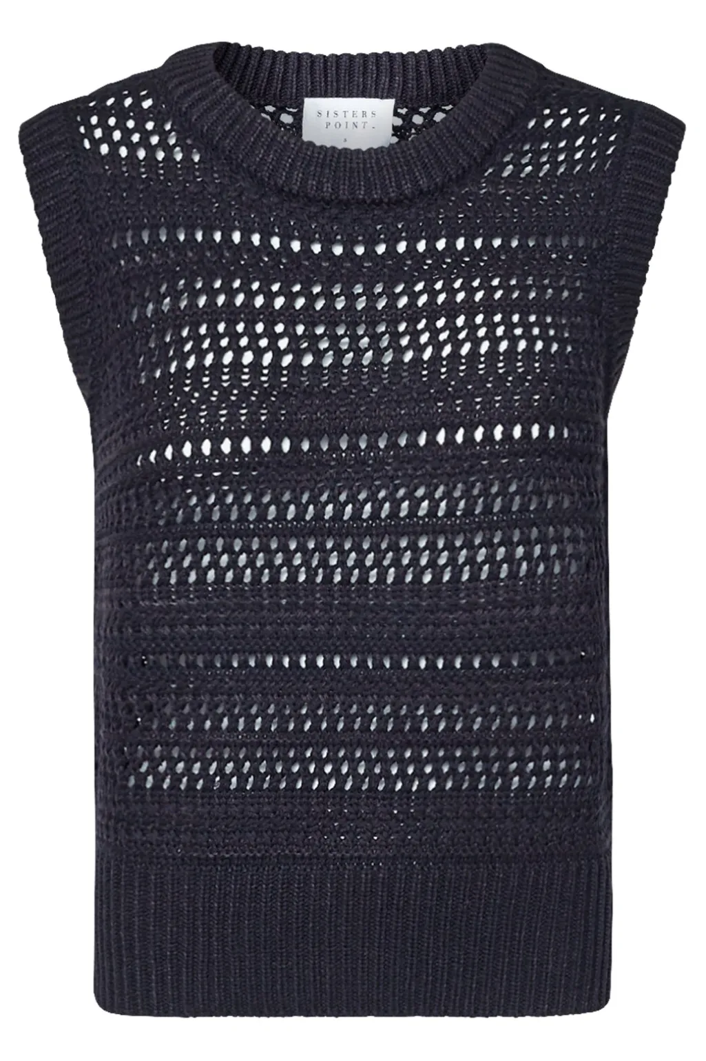 Sort ærmeløs vest fra Sisters Point med et hulmønster i strikket akryl og bomuld. Vesten har en rund halsudskæring og passer til hverdagen.