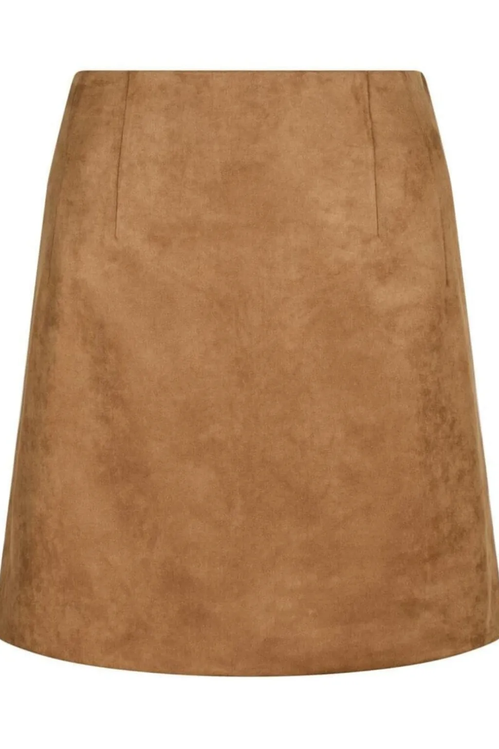 Kort nederdel fra Neo Noir i imiteret ruskind med cognacfarvet overflade. A-line designet og den glatte tekstur giver nederdelen et rent og enkelt udtryk.