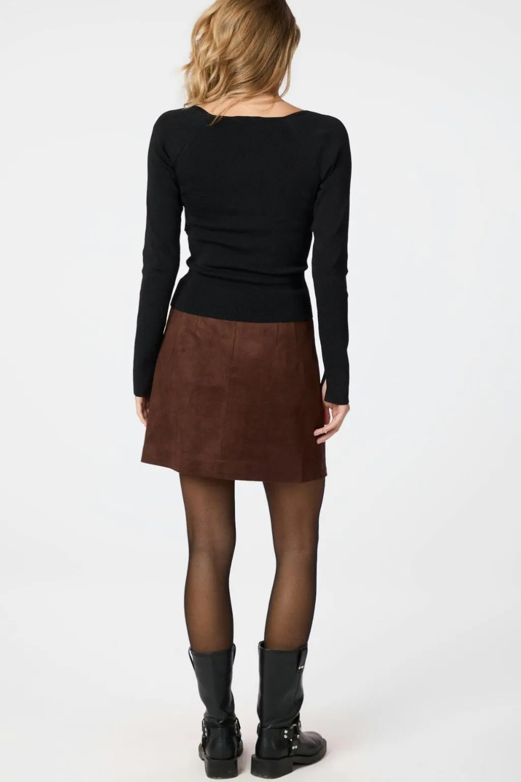 Brun nederdel i imiteret ruskind fra Neo Noir. Den har en A-linje silhuet og er skåret i lårlængde med en regulær talje og lynlås lukning.
