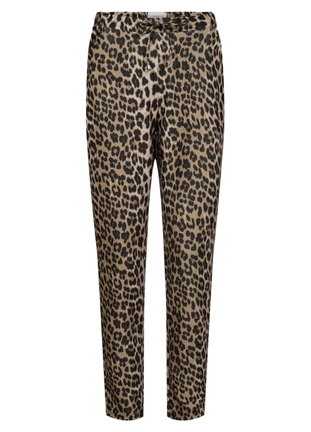 Bukser fra Liberte i et brunt leopardmønster. De har et tapered snit og en talje med bindebånd. Bukserne er lavet i et blødt stof med stretch.