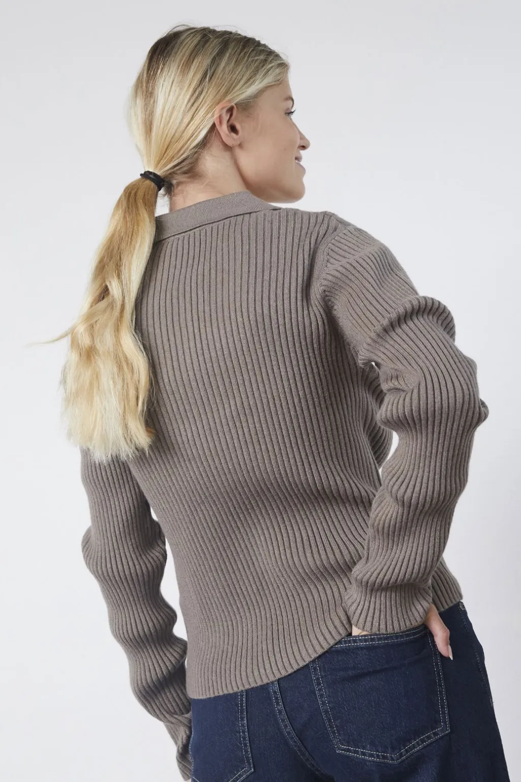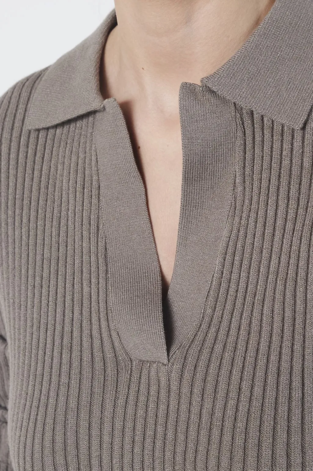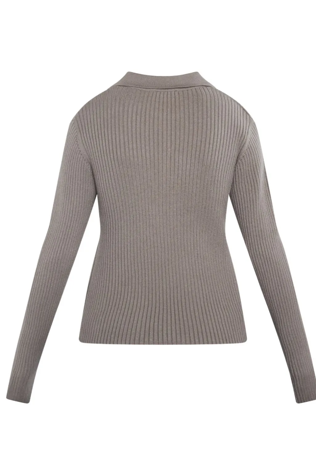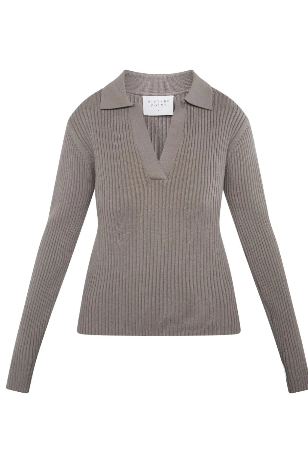 Ribstrikket trøje fra Sisters Point i en jordfarvet nuance. Trøjen har lange ærmer, en klassisk polokrave og en V-udskæring.