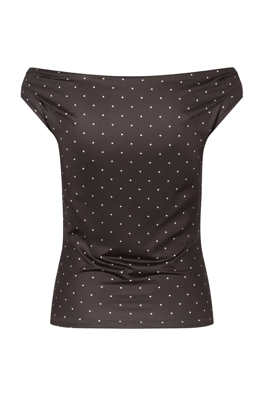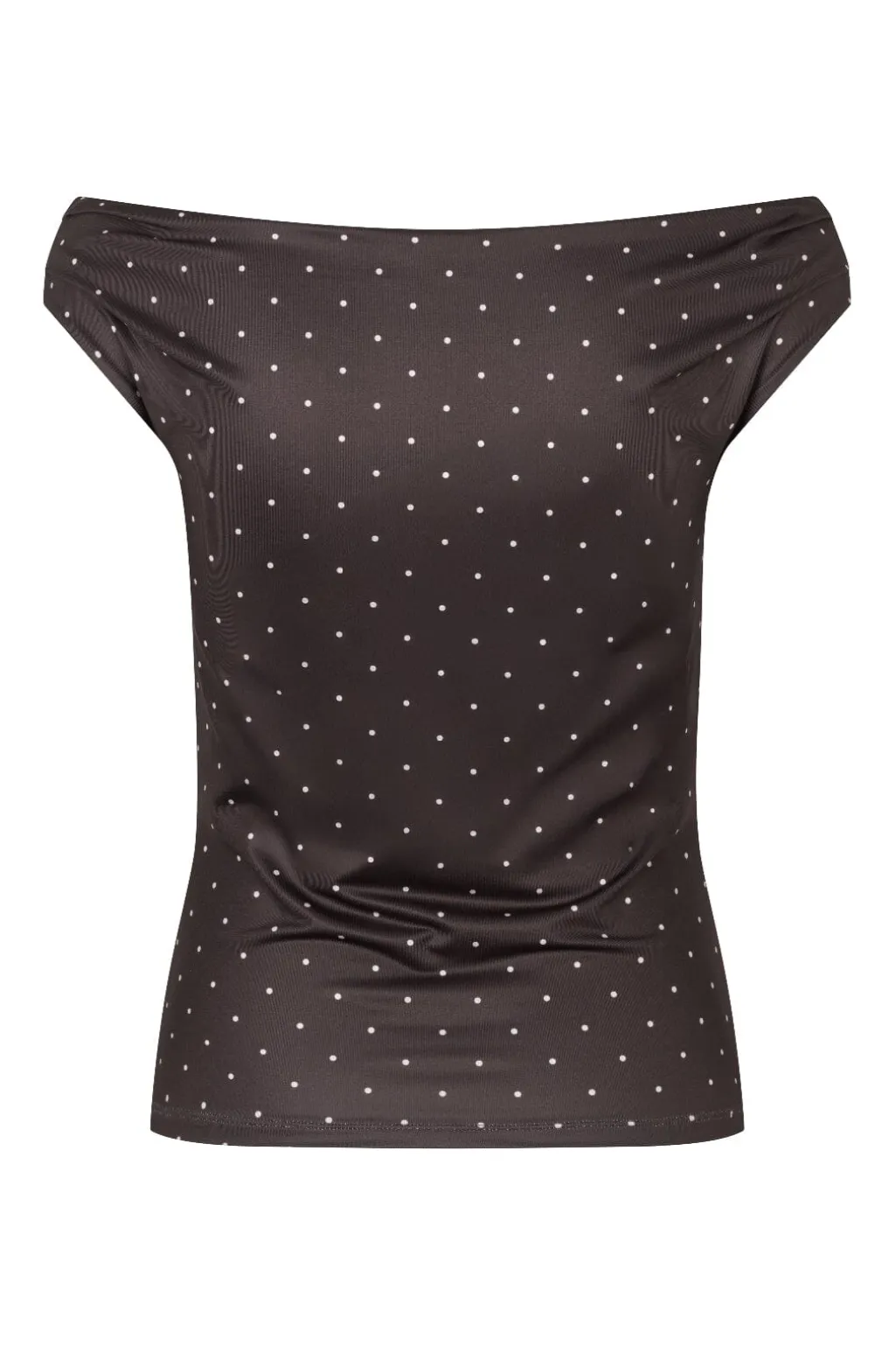 Off-shoulder top fra Modström i brun med hvide prikker. Toppen har en tætsiddende pasform og korte ærmer med rynkedetaljer.